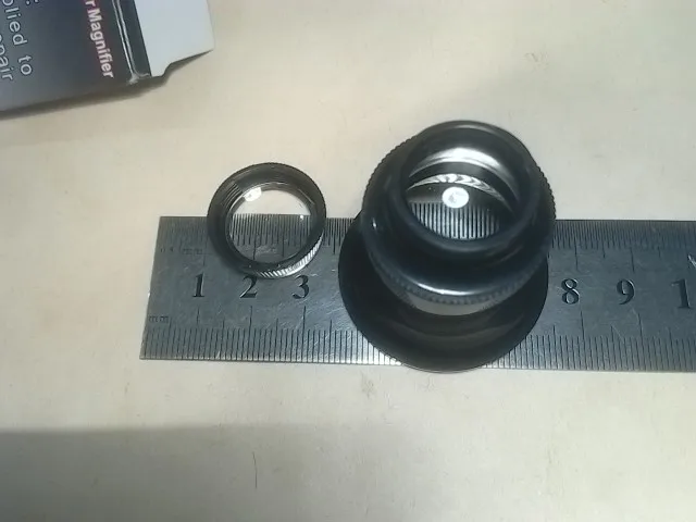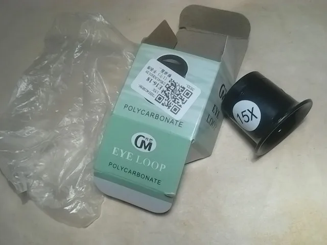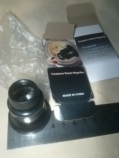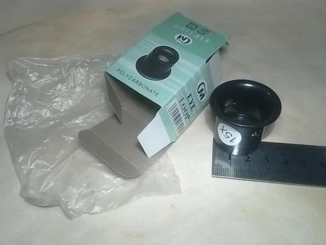 Быстрая отправка. Бесплатная доставка до почты. Упаковано в конверт без внутренней пупырки, внутри коробочки, в пакетике лупа. Линзы пластиковые, чистые, без царапин, увеличивают равномерно, без искажений. Вес 12грамм. По бокам отверстий для держателя нет. Фокусное расстояние 1см.(очень мало), нужно подсвечивать сбоку, иначе из-за близкого рассстояния лупы, тень и ни чего не видно. Работать инструментами одновременно с этой лупой практически не возможно(нет места для инструмента), только разглядывать. Но все разбирается, соединения с резьбой и можно использовать линзы по отдельности, у линзы маленького и большого диаметра увеличение одинаковое, больше x4 и меньше x10(по сравнению с советской лупой x4, x10), на максимальном удалении-3,5см, дальше расплывается. На фото для сравнения с лупами x10 и x15, но они оказались абсолютно одинаковыми.