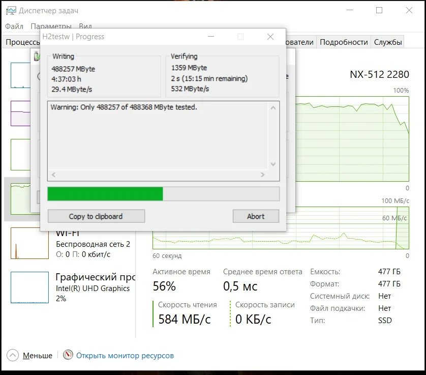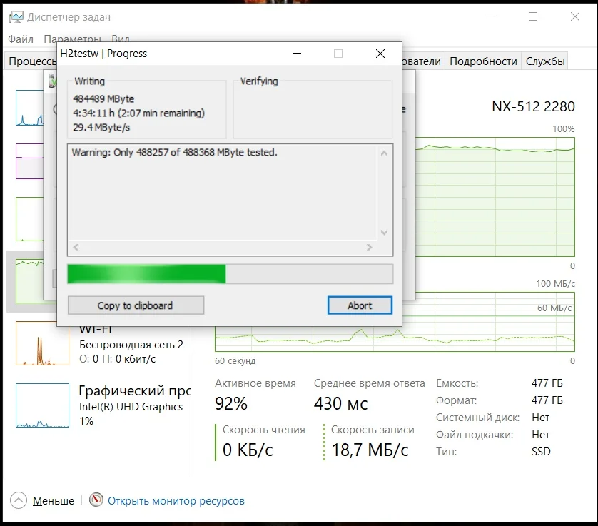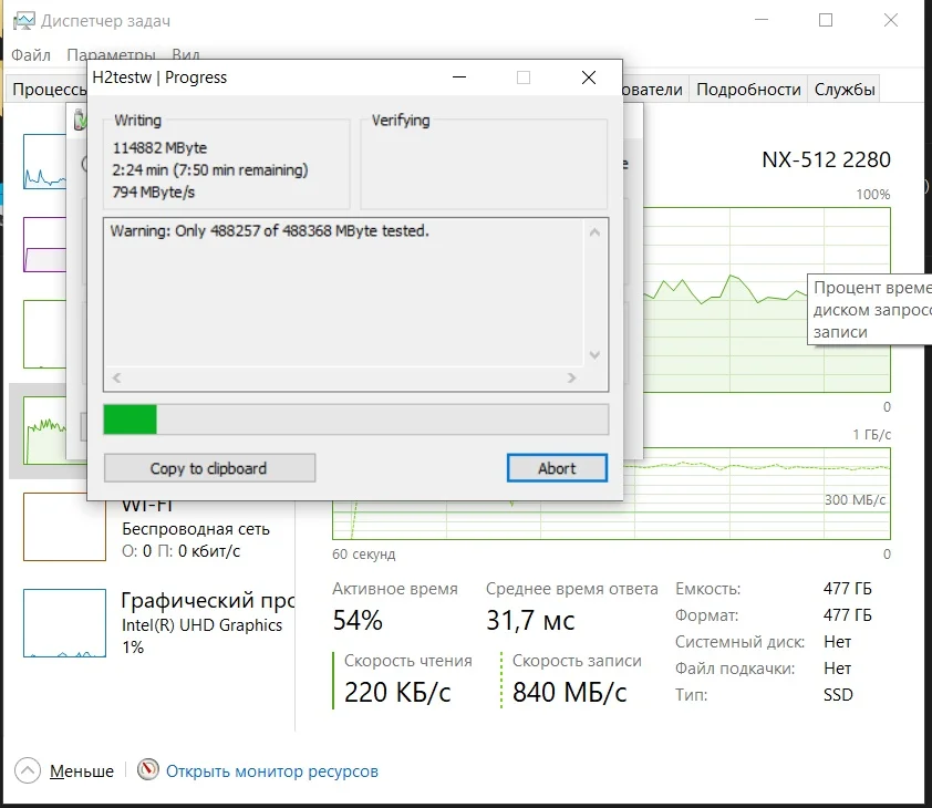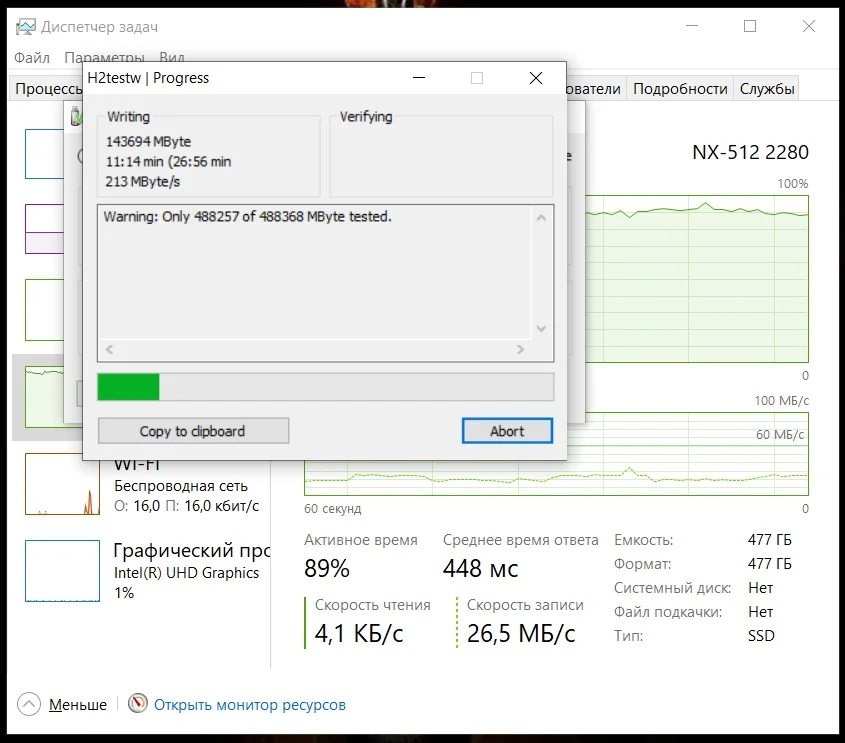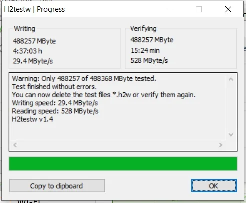 Товар пришёл быстро. Внешних повреждений нет, упаковка, также цела. Проверил с помощью программы H2testw v1.4. При записи, первые 3 минуты (около 130 ГБ) скорость держалась в районе 800 МБ/с, после чего упала до 20-25 МБ/с и держалась так вплоть до полной записи диска. Чтение же шло с постоянной скоростью, чуть больше 500 МБ/с. Вот отчет после проверки: "Warning: Only 488257 of 488368 MByte tested. Test finished without errors. You can now delete the test files *.h2w or verify them again. Writing speed: 29.4 MByte/s Reading speed: 528 MByte/s H2testw v1.4"