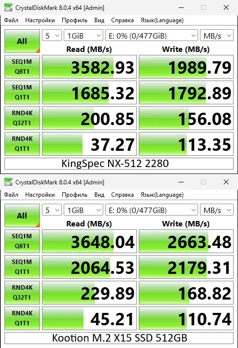 Заказ доставили за 12 дней из Китая. Заказал диск 512GB, т.к. были отзывы о наличии TLC 3D NAND памяти в дисках этого объема. Но наперсточники KingSpec прислали диск с QLC памятью! Мало сказать, что я разочарован бендом KingSpec, я просто люто зол! Тут же заказал KOOTION X15 M.2 SSD 512GB с доставкой с российского склада AliExpress. Без сомнений KOOTION - это noname и еще более подвальный производитель, чем KingSpec. Однако полученный от них диск вполне годный, выпущен на том же контроллере MAP1202 и хоть с дешевыми китайскими чипами YMTC, но всё же TLC 3D NAND. Сравнения прилагаю. Не рекомендую этого продавца и его низкопробный товар.
