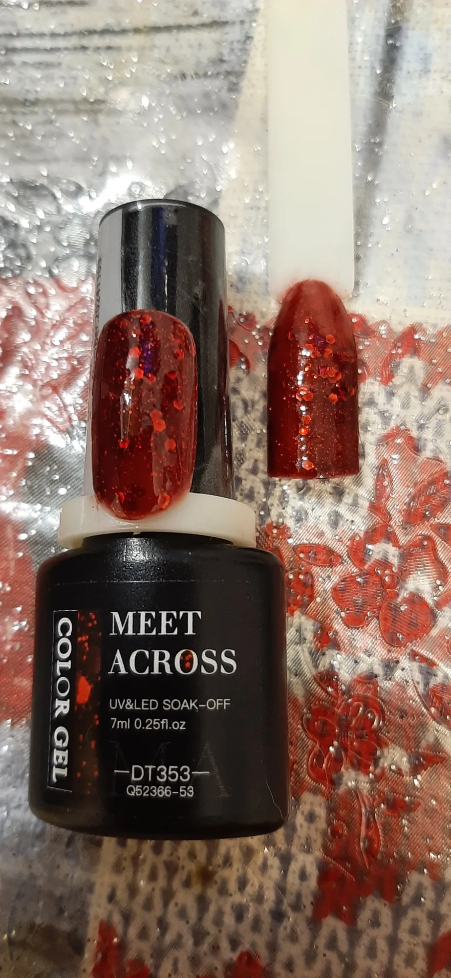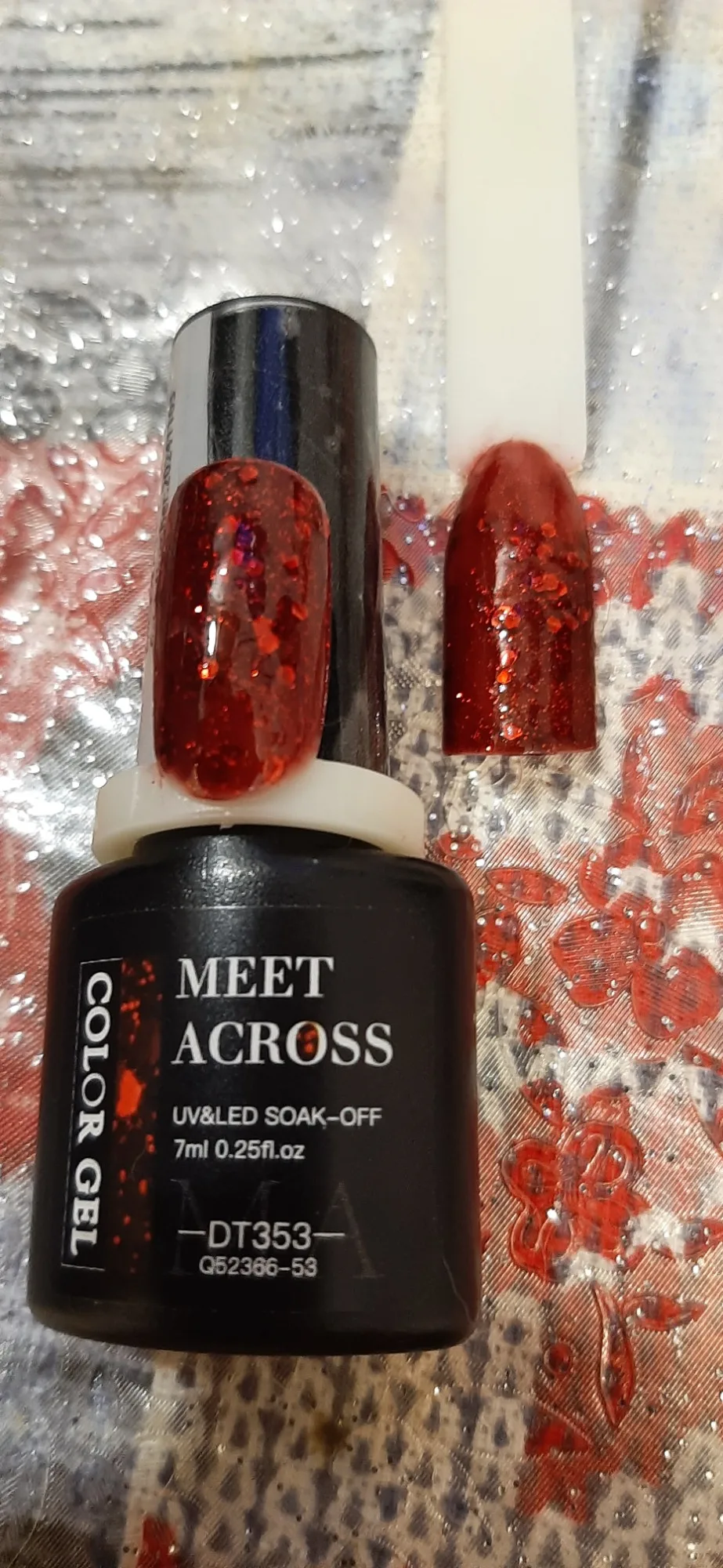 Потрясающий гель лак. У него такой глубокий бардовый цвет, и из него, как будто из глубины пробивпются вкрапления ярко алые блестящие😍Спасибо большое. Выписала сначала один, очень понтравился, приобрела ещё два. Срок годности отличный👍фото не передает красоты мерцания алых вкраплений.😍