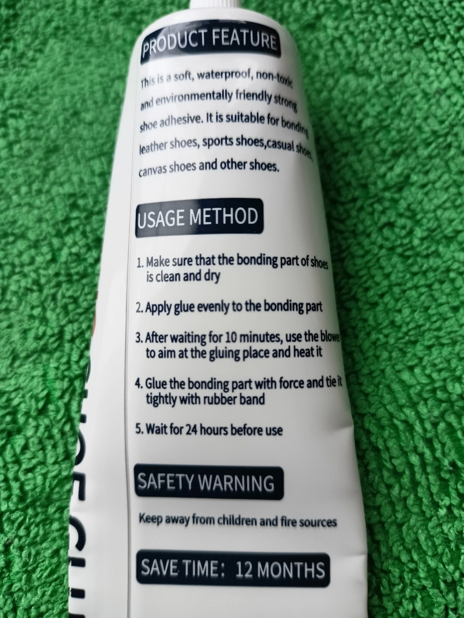 Я так понял, что мне ещё повезло: тюбик был пуст всего наполовину. Инструкция вааще не соответствует сайту, фото привожу. Пытался подклеивать внутри голенища задники у берцев: промыл, обезжирил, нанёс, выждал, прогрел строительным феном, плотно сжал. Ну, да, вроде держит. Но уверенно скажу со всей прямотой: на отечественных маркетплейсах полно более дешёвых, понятных и рабочих обувных клеев. Более вменяемых и честных. А тут больше фуфломицина во всём...
