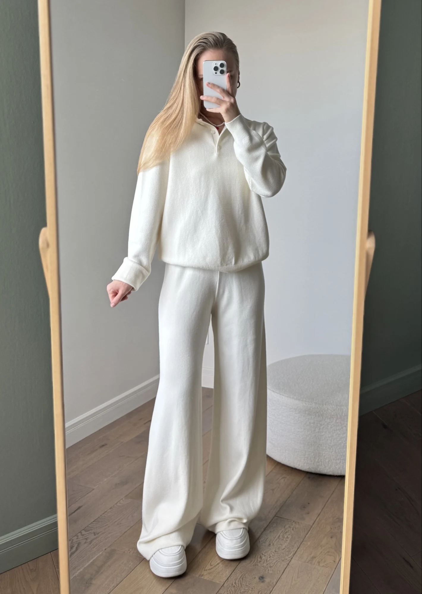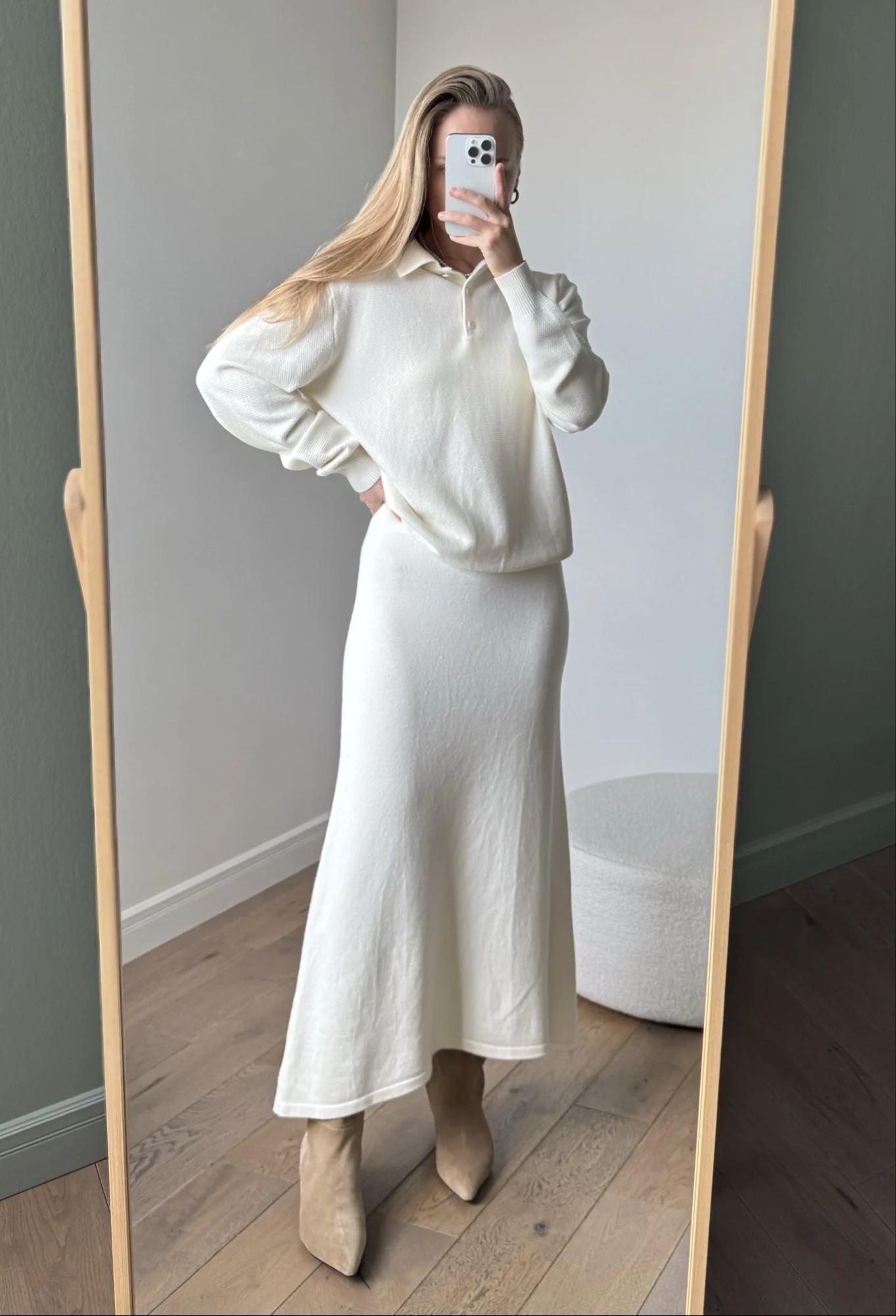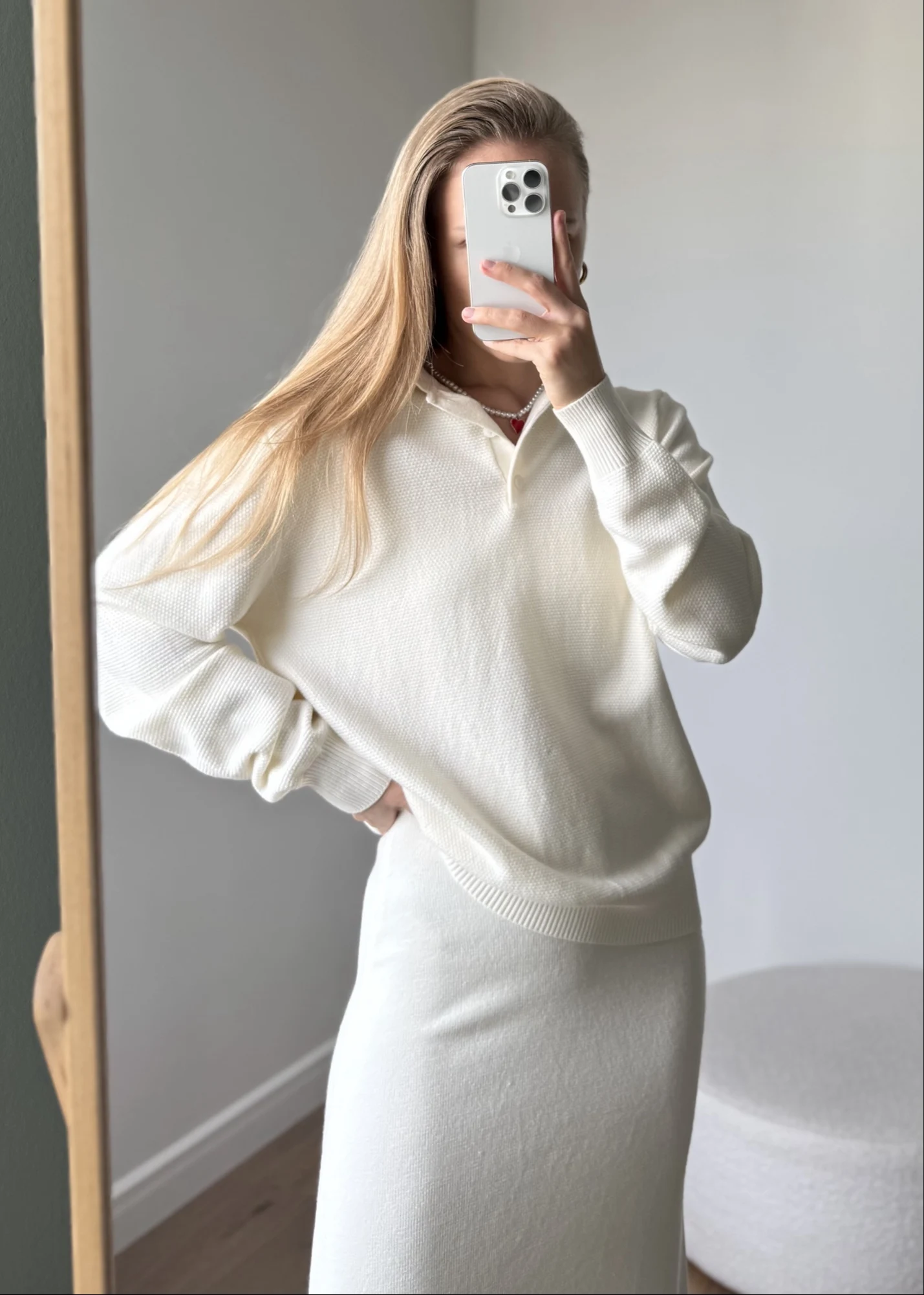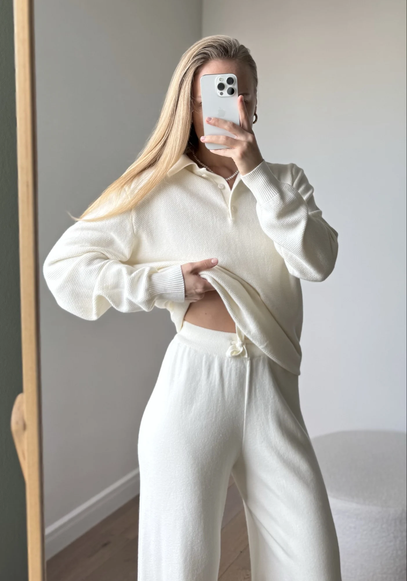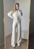 Трикотажный костюм в молочном цвете На свои параметры 80/63/94, рост 165 см я взяла размер S. Костюм в целом сел хорошо, в меру свободно, но вот брюки оказались сильно велики мне по росту. Интересный факт, что до отпаривания длина брюк была ~104 см, а после ~115 см. Так что костюм отлично подойдёт на высокий рост, если воспользоваться отпаривателем)) Состав: 50% вискоза, 28% полиэстер, 22% нейлон. Материал мягкий, приятный и отлично тянется. Обратите внимание, что верх и низ отличается по фактуре: верх выполнен из фактурного трикотажа, а юбка и брюки из гладкого трикотажа.