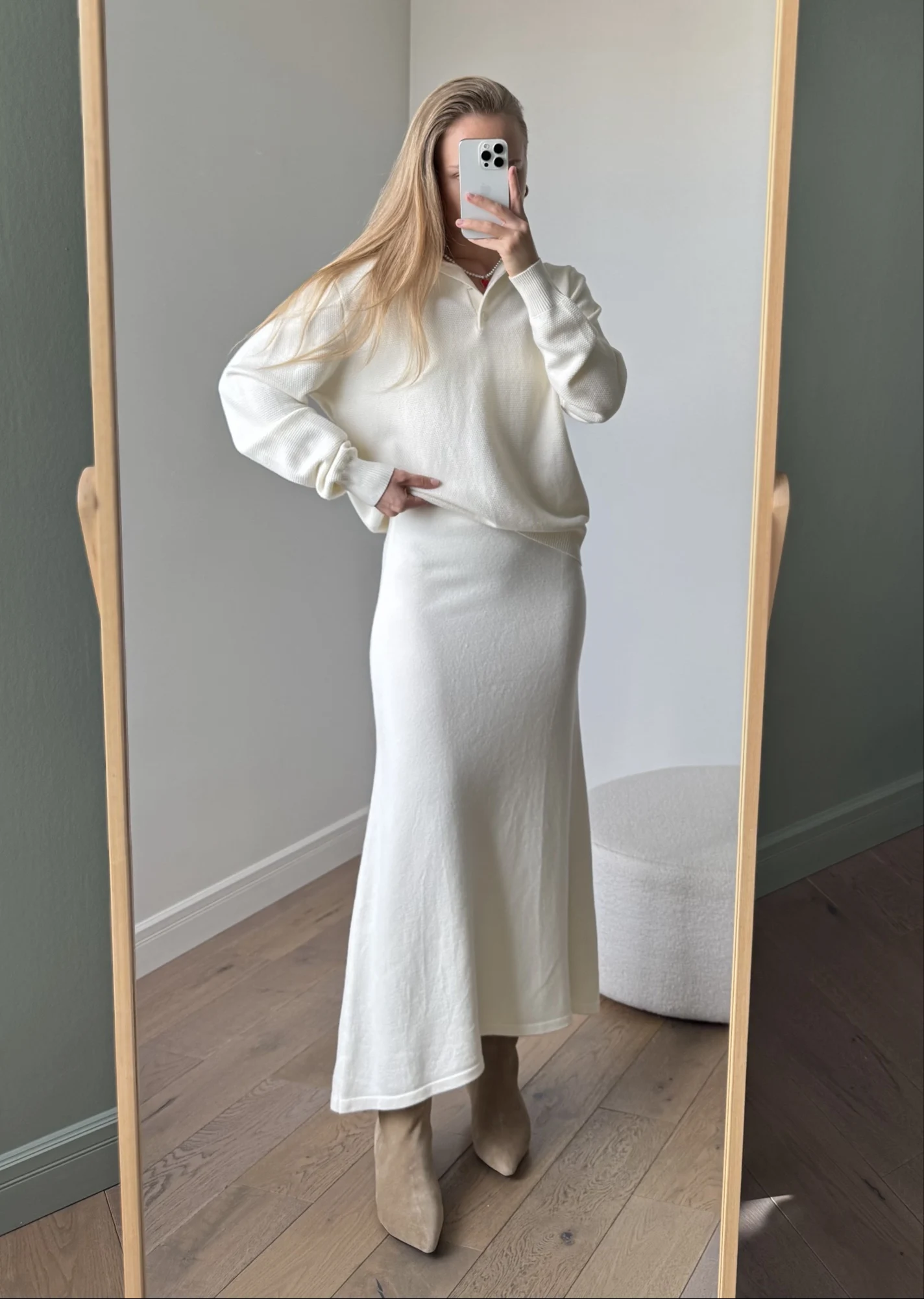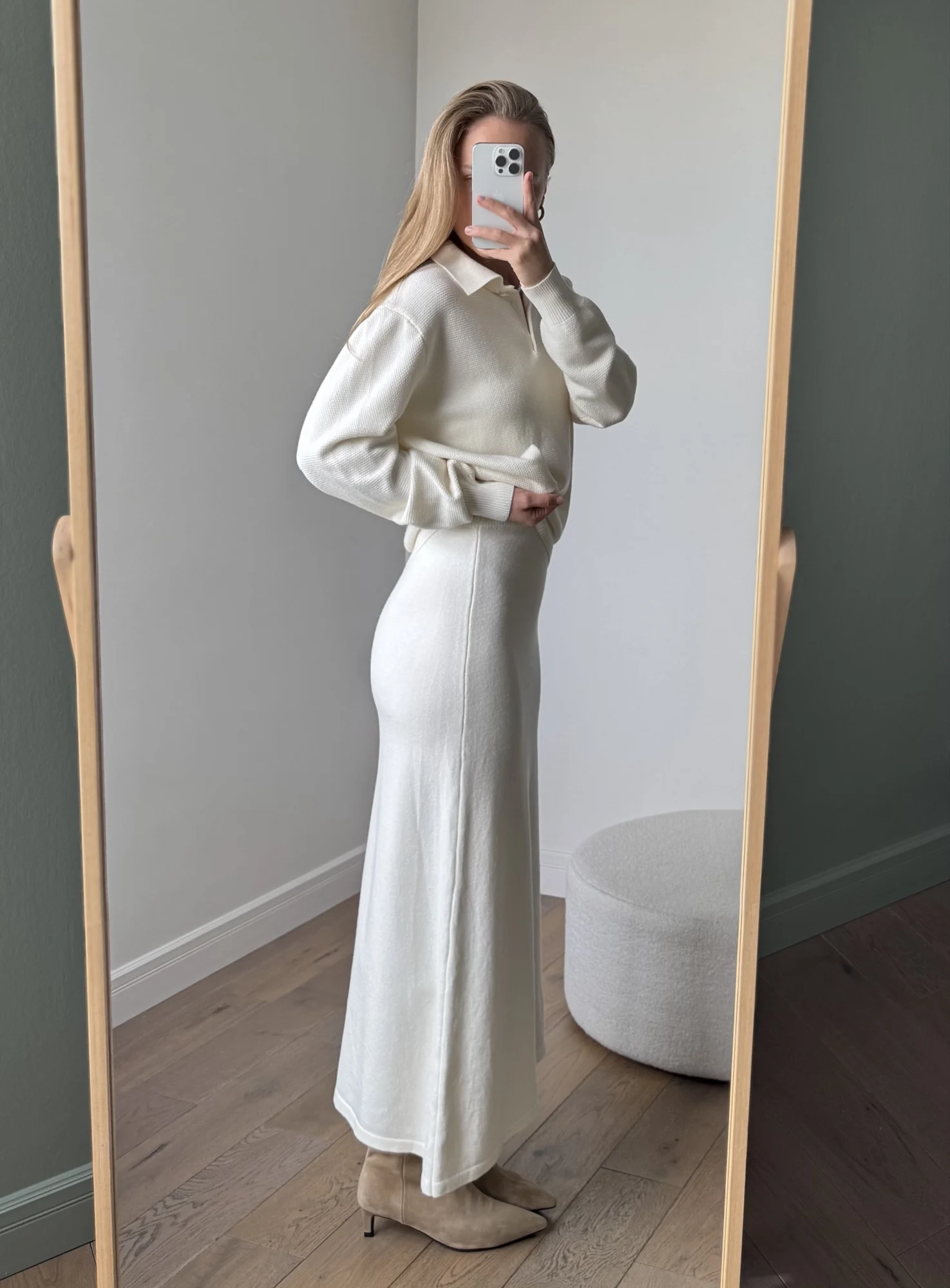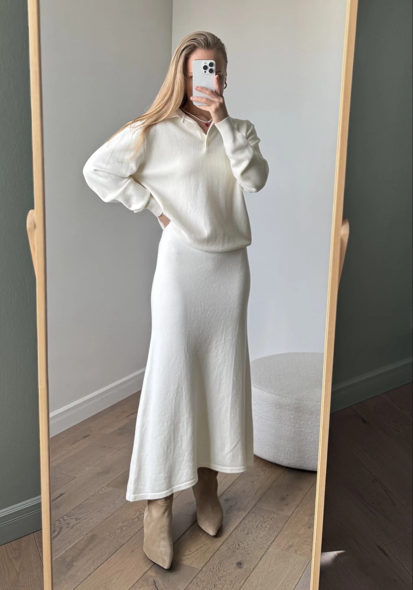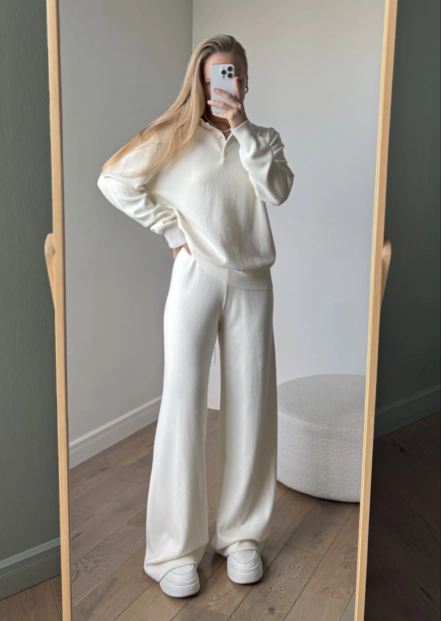 Трикотажный костюм в молочном цвете На свои параметры 80/63/94, рост 165 см я взяла размер S. Костюм в целом сел хорошо, в меру свободно, но вот брюки оказались сильно велики мне по росту. Интересный факт, что до отпаривания длина брюк была ~104 см, а после ~115 см. Так что костюм отлично подойдёт на высокий рост, если воспользоваться отпаривателем)) Состав: 50% вискоза, 28% полиэстер, 22% нейлон. Материал мягкий, приятный и отлично тянется. Обратите внимание, что верх и низ отличается по фактуре: верх выполнен из фактурного трикотажа, а юбка и брюки из гладкого трикотажа.