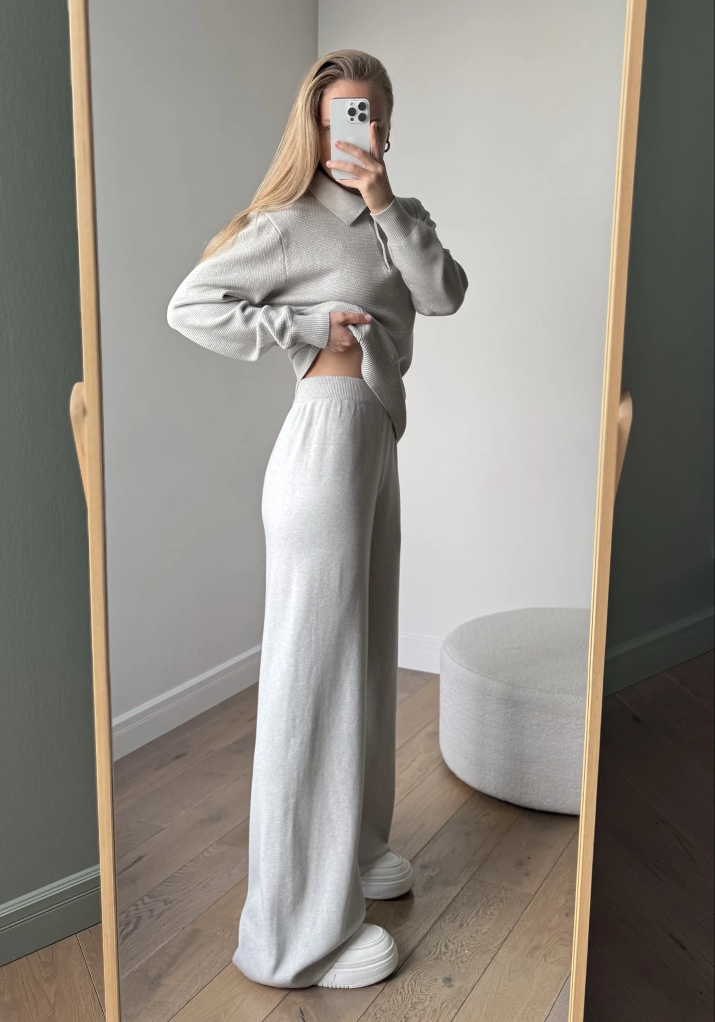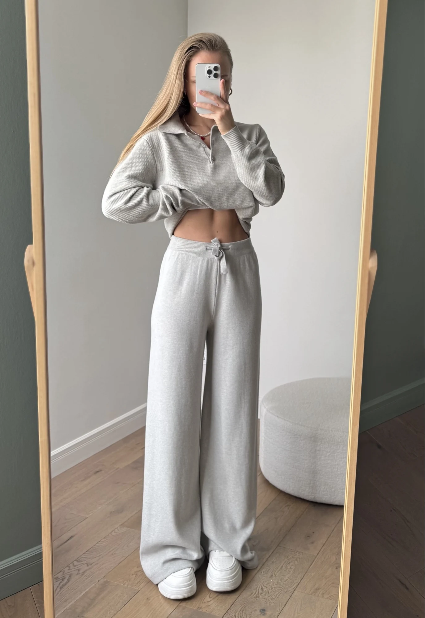 Трикотажный костюм в сером цвете На свои параметры 80/63/94, рост 165 см я взяла размер S. Костюм сел в меру свободно, а брюки оказались мне велики по росту. Интересный факт, что до отпаривания длина брюк была 103 см, а после — 111 см. Костюм отлично подойдёт на высокий рост, если воспользоваться отпаривателем))) Состав: 50% вискоза, 28% полиэстер, 22% нейлон. Материал мягкий, приятный и отлично тянется.