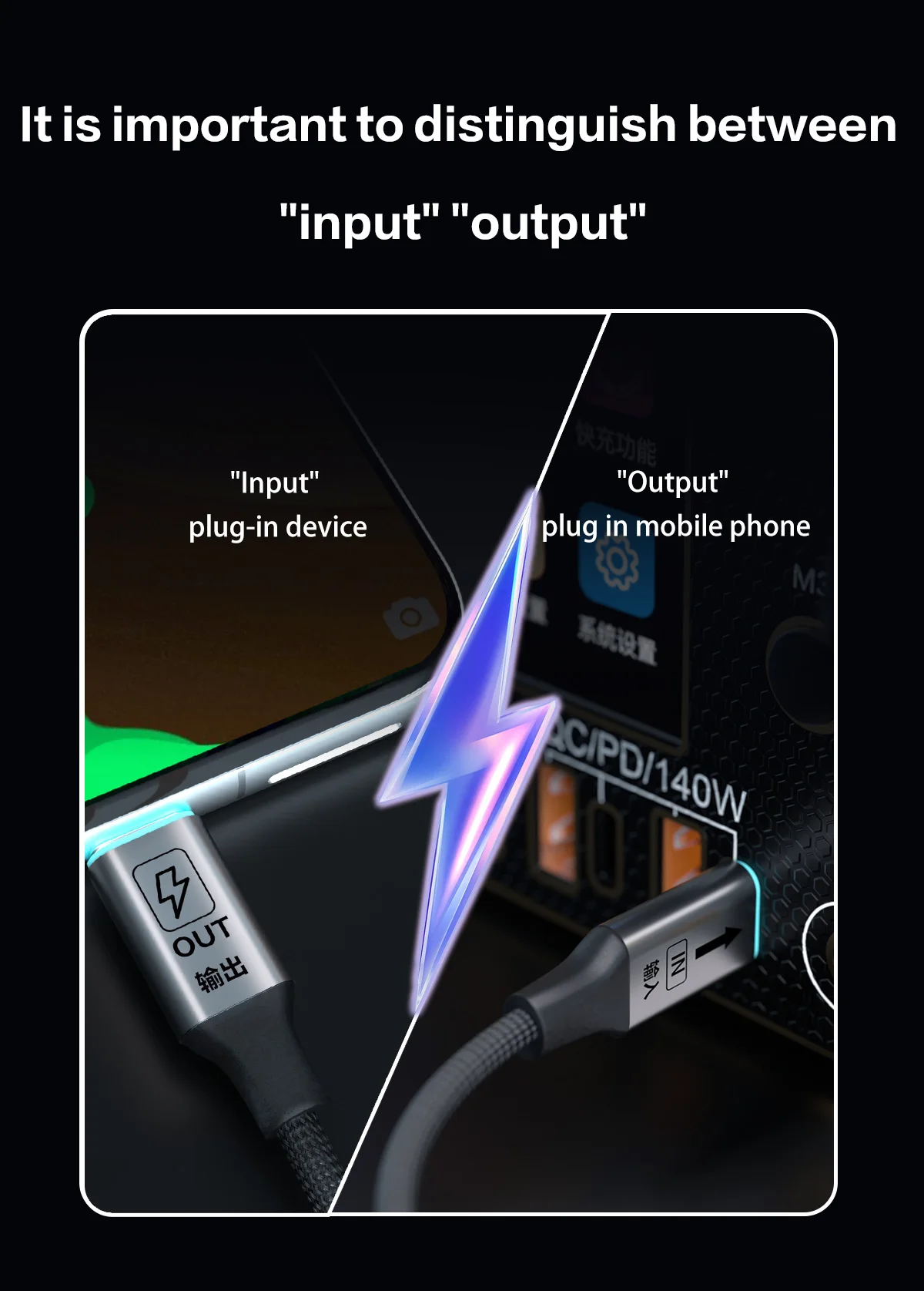 2.Кабель передачи данных необходимо различать между портами «ввода» и «вывода».«вход» подключается к устройству, а «выход» подключается к мобильному телефону.Если допустима ошибка, это может повлиять на эффект зарядки.