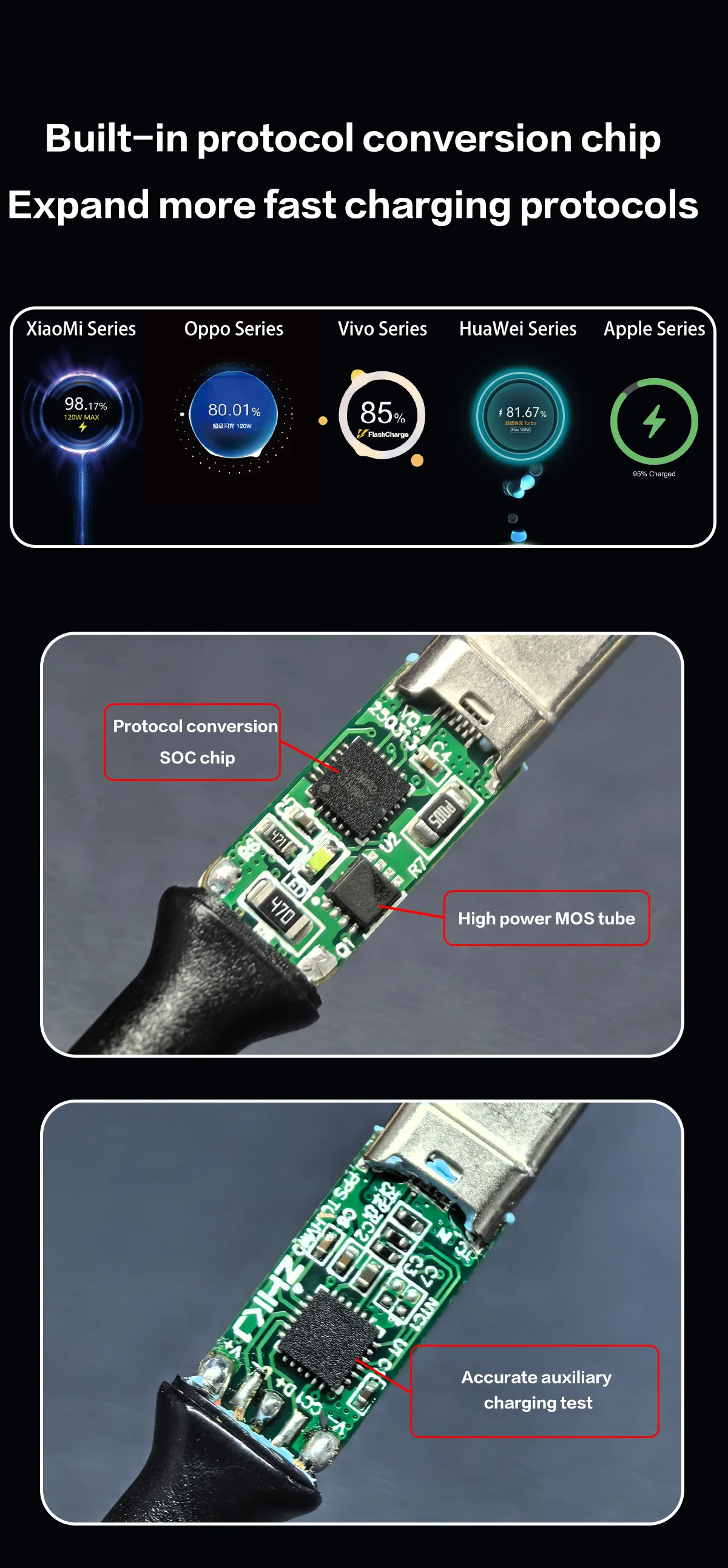3.Встроенный интеллектуальный чип преобразования протокола.Этот кабель для передачи данных подходит для основных марок мобильных телефонов, таких как Huawei/Honor, OPPO/OnePlus, VIVO/iQOO, iPhone 15/16, Xiaomi/Redmi и т. д.Он совместим с зарядными головками и мобильными источниками питания, поддерживающими протокол PPS, и может быть преобразовано в частный протокол для быстрой зарядки.