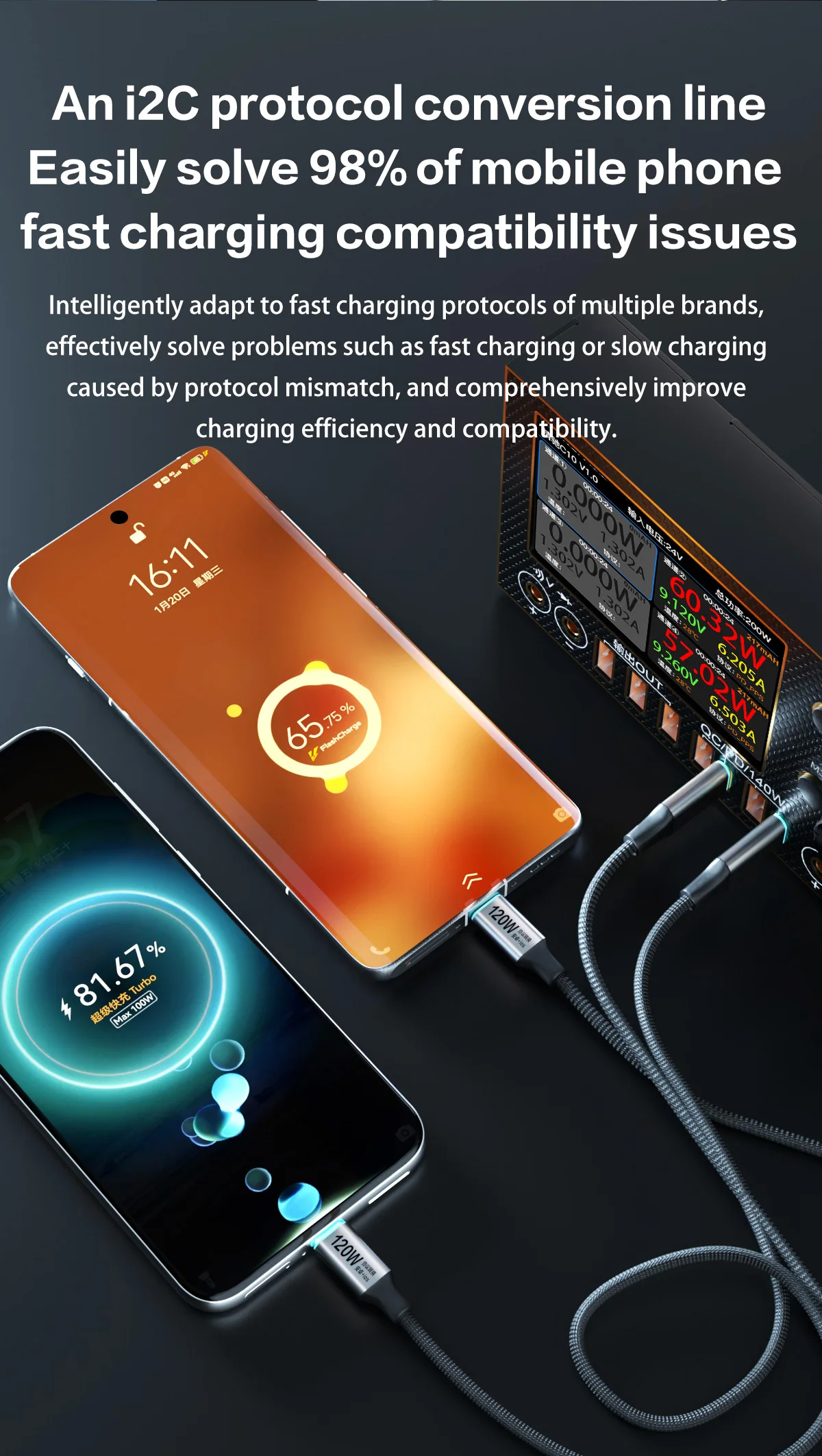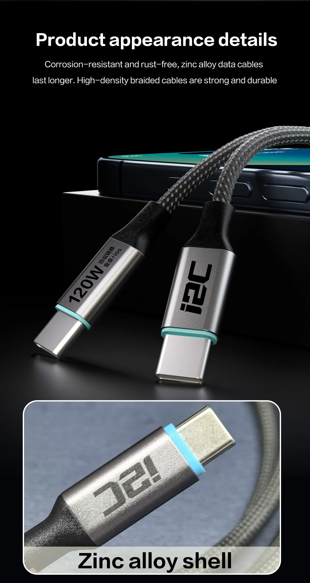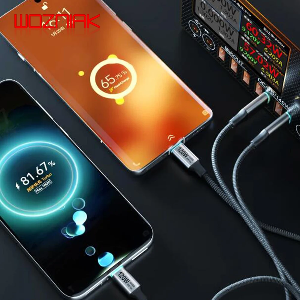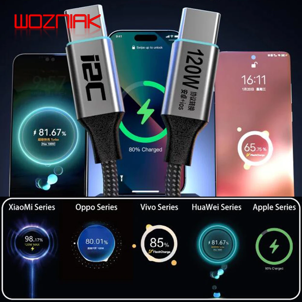 1.Универсальный зарядный кабель для вспышки i2C Turbo поддерживает быструю зарядку высокой мощности 65 Вт/120 Вт, отвечающую требованиям к высокоскоростной зарядке мобильных телефонов, планшетов и других устройств;В то же время он использует 140-жильный толстый медный провод, что делает зарядку более стабильной.