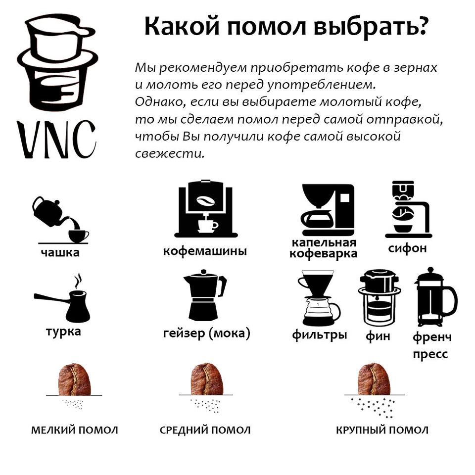 Мы рекомендуем приобретать кофе в зернах и молоть его перед употреблением, конкретно под Ваш способ заварки. Однако, если вы выбираете молотый кофе, то мы сделаем помол перед самой отправкой, чтобы Вы получили кофе самой высокой свежести.