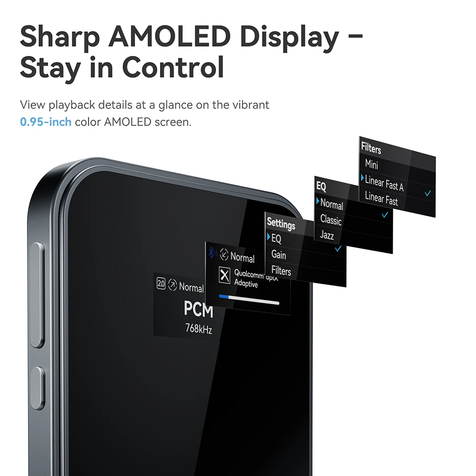 Ультратонкий и удобный для карманов с AMOLED-дисплеем. Чай Pro весит всего 96 г и толщину всего 7,85 мм и имеет размер кредитной карты, что позволяет легко носить его куда угодно.Его яркий 0,95-дюймовый экран AMOLED сразу отображает информацию о воспроизведении, обеспечивая вам контроль в дороге.