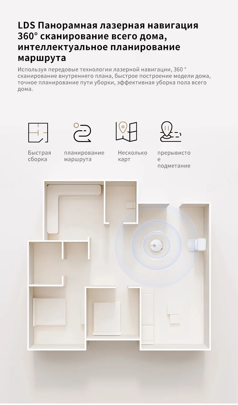 * Интеллектуальная навигация и предотвращение препятствий: 110° широкоугольное лазерное обнаружение и панорамная лазерная навигация LDS обеспечивают точное планирование пути очистки и предотвращение препятствий на миллиметроне уровне.