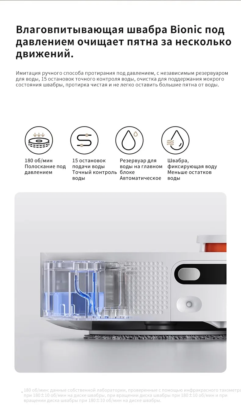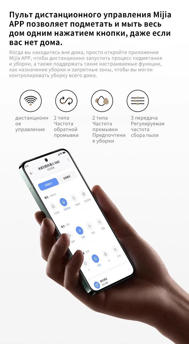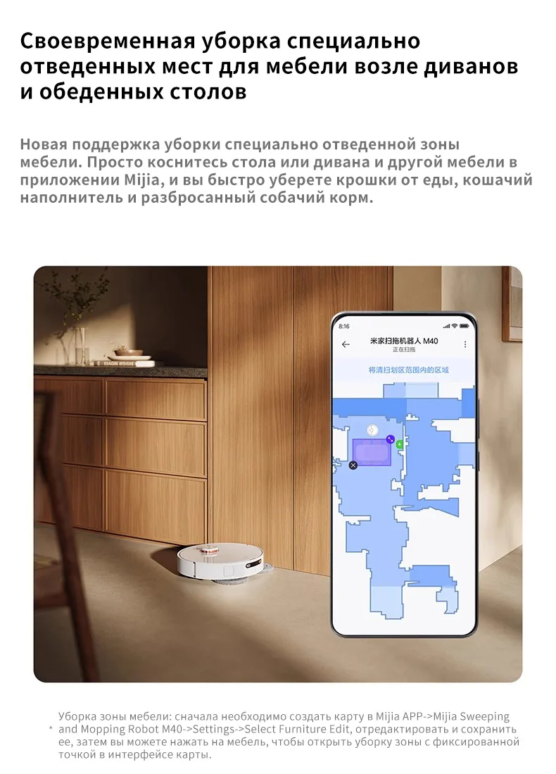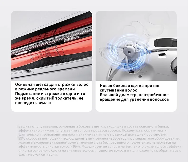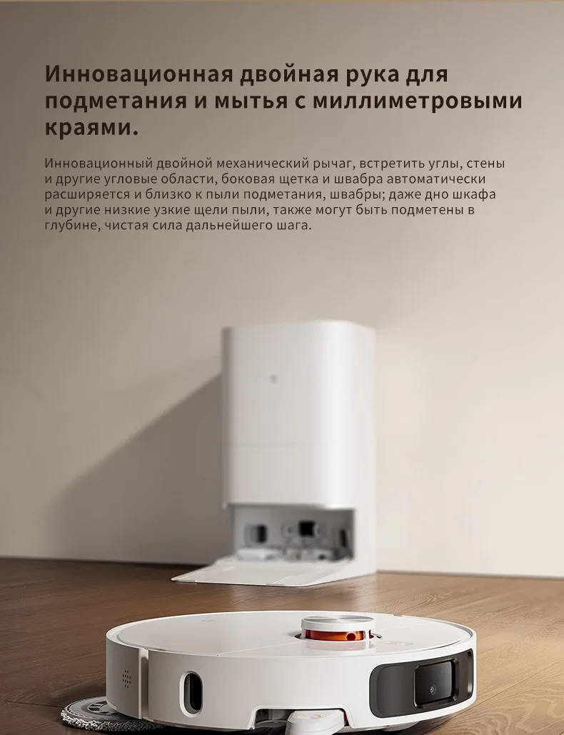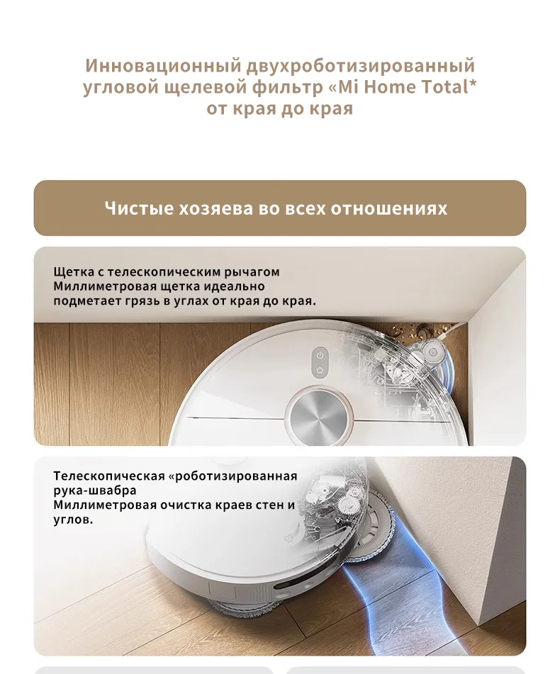 * Гибкие методы очистки: автоматически поднимает боковые щетки и швабры для адаптации к различным типам полов и позволяет специально чистить мебель.
