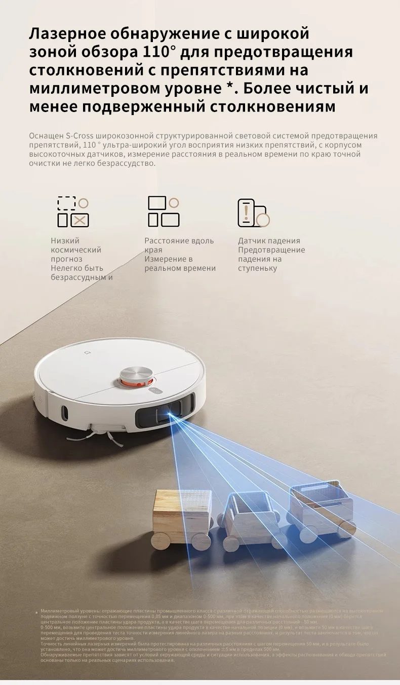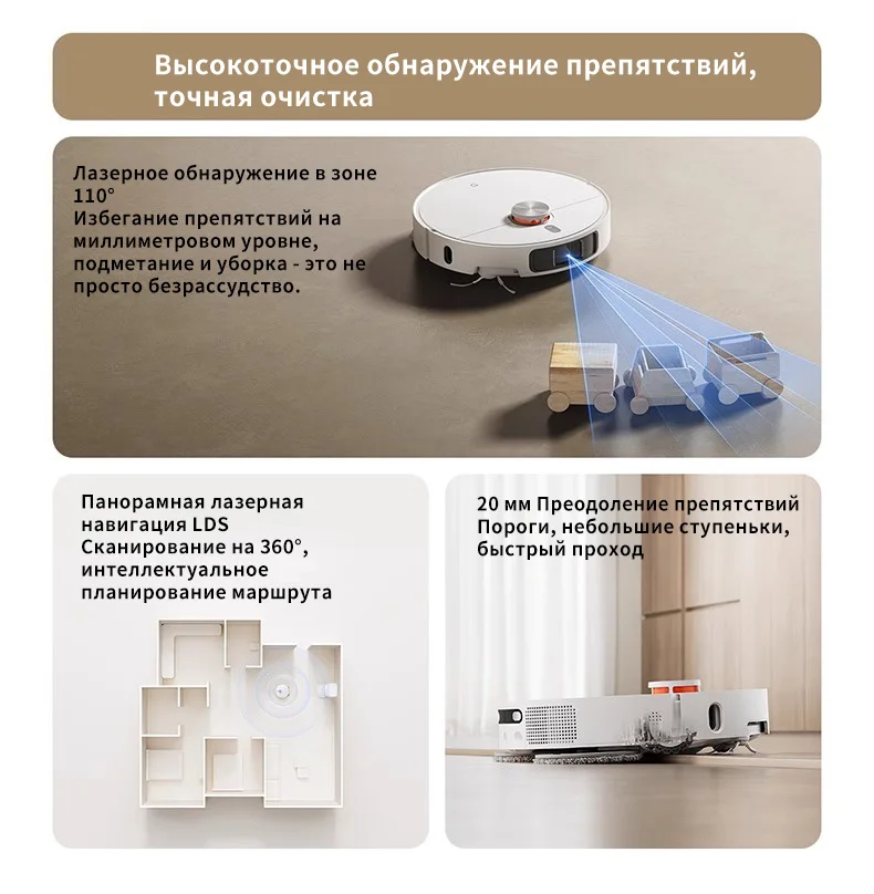 * Панорамная лазерная навигация LDS: оснащена S-Cross.м широкая структурированная система предотвращения препятствий, имеет 110° Сверхширокоугольное восприятие низких препятствий.