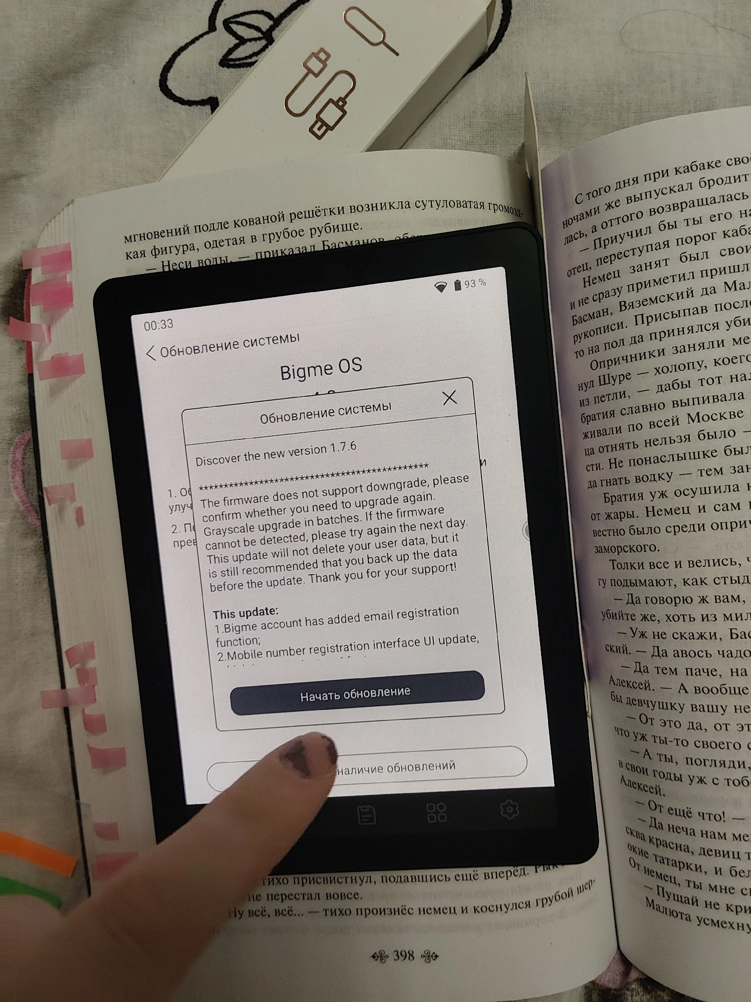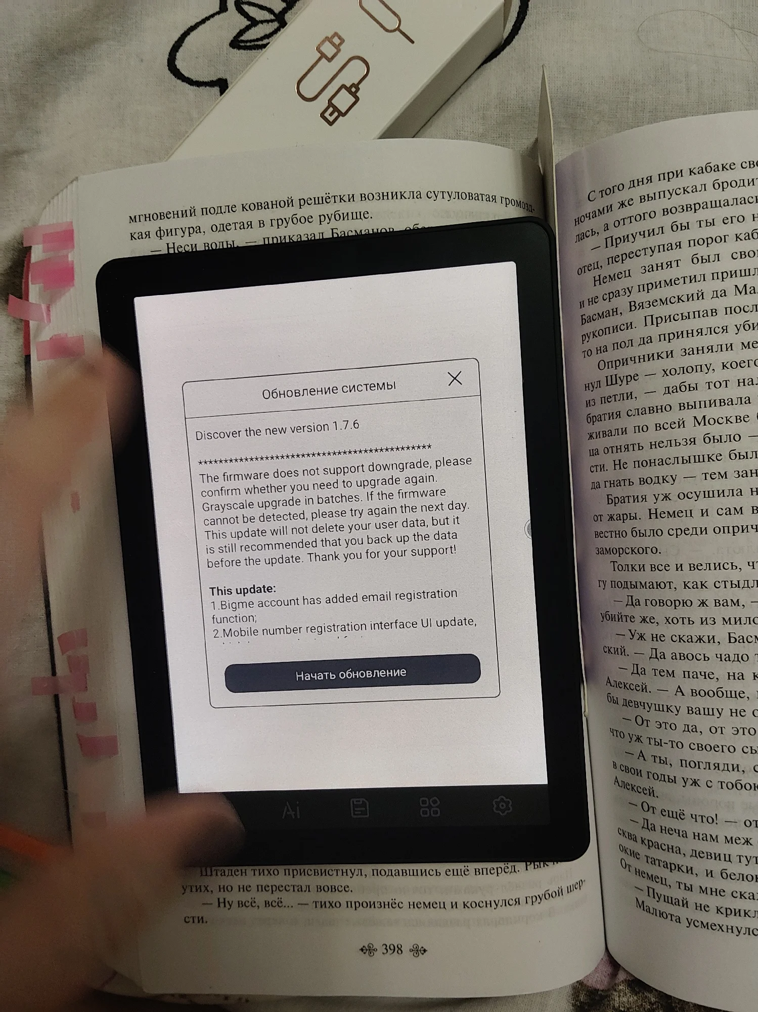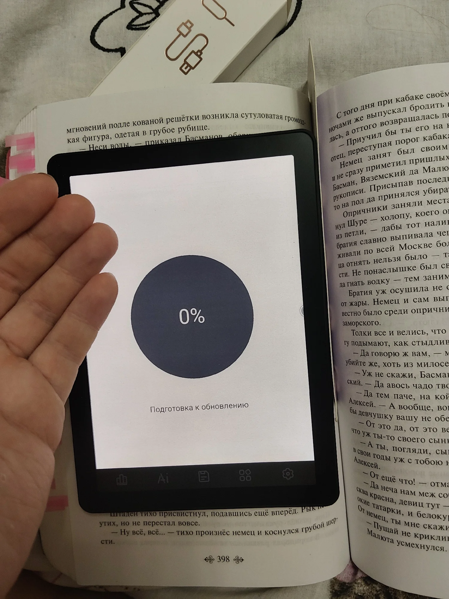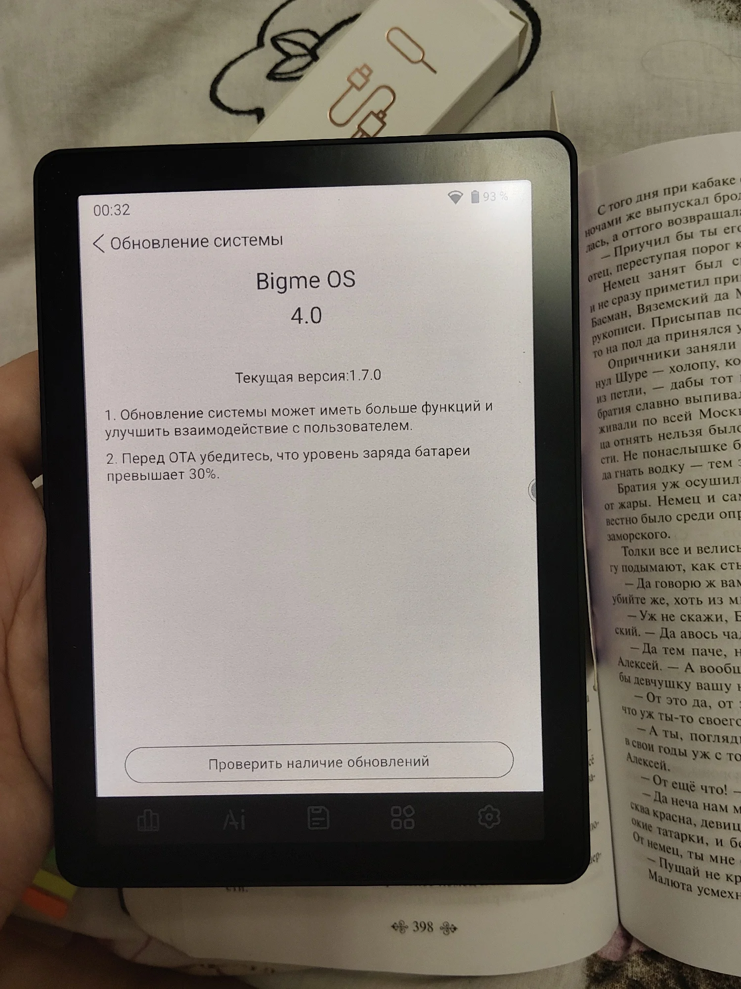 работает хорошо, прекрасно грузит книги. единственное я не понимаю почему обновление не загружается. совсем. пытаюсь уже 2 часа с ним бороться, оно вообще не загружается. застыло и ни в какую. но пока оно вроде не волнует меня, но меня плажка обновлений жутко смущает. так шрифт можно менять, сенсорное управление в большинстве случаев и есть кнопки внизу. можно менять регулировку цвета. доставлено в идеальном состоянии. коробка от книги прекрасная. как раз то что надо для учёбы.
