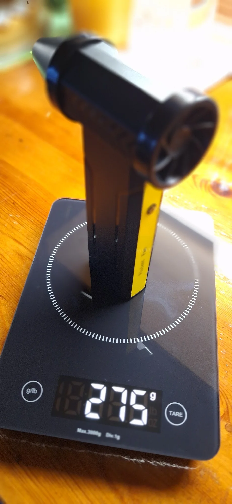 Пришел быстро. Изготовлен довольно качественно . Дует около 190г в max. Тактильно на ощупь приятно. В сравнении другая популярная дуйка, чуть слабее. Около 140г. При том , что обороты у нее выше (160 тысяч/мин), даже на слух. Но она и дешевле. Правда в руке лежит лучше, сопло фиксируется по-другому, надёжнее и управление одной кнопкой. По мне удобнее.