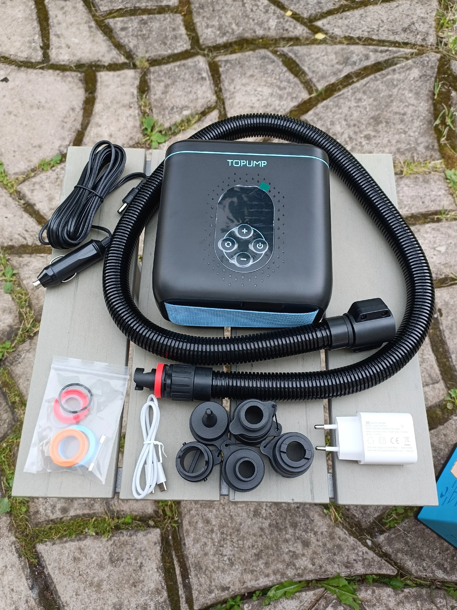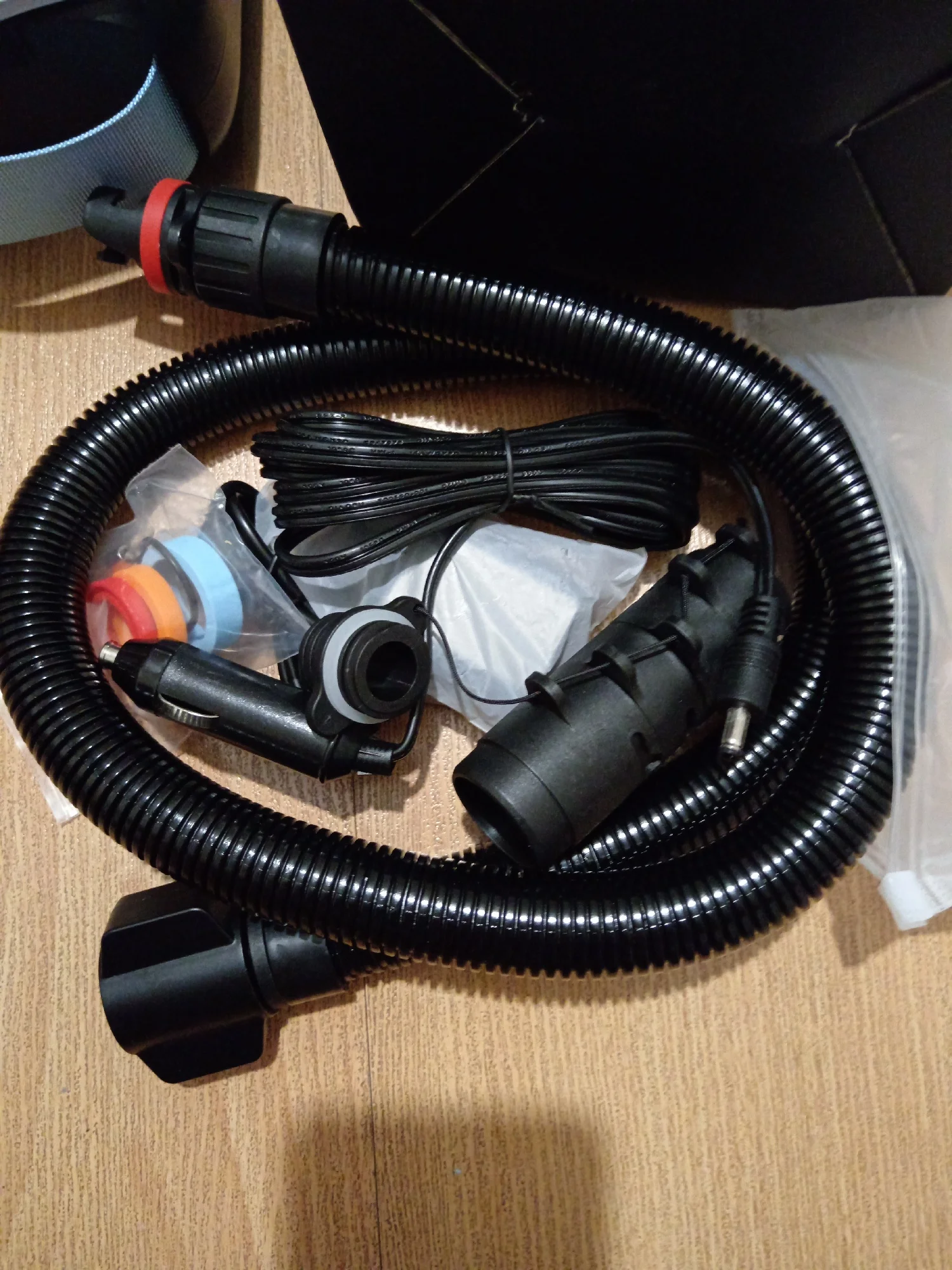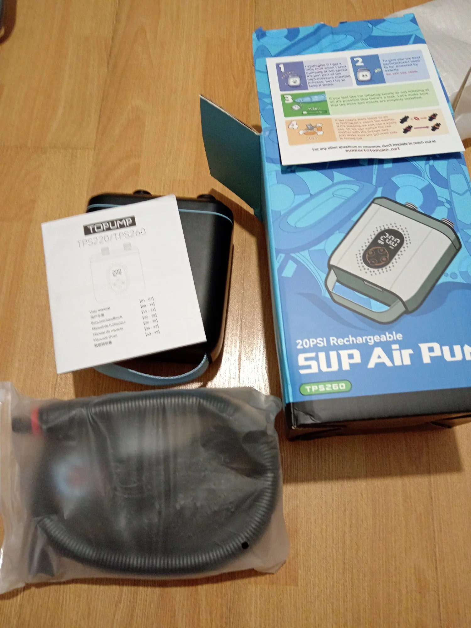 Доставка была заявлена до 12июня, по факту привезли на неделю позже. комплектация на фото. Блок питания в комплекте. пришел заряженным на 3 деления. От аккумулятора накачал SUP 11' (335 см) до 15PSI за 10 минут. 12PSI - 7 минут 30 секунд. В походных условиях, будучи полностью заряженным, накачал 2 одинаковых доски и два матраса в палатках, после чего так же откачал воздух из досок и одного матраса и заряд закончился. Работает как Пауэр банк, в случае чего можно от него телефон подзарядить, например. Из минусов, пожалуй, только отсутствие чехла для переноски, надо будет отдельно под него какую нибудь сумочку подобрать. брал за 5900 (с доставкой до постамата). ищ всех насосов которые пробовал пока самый интересный.