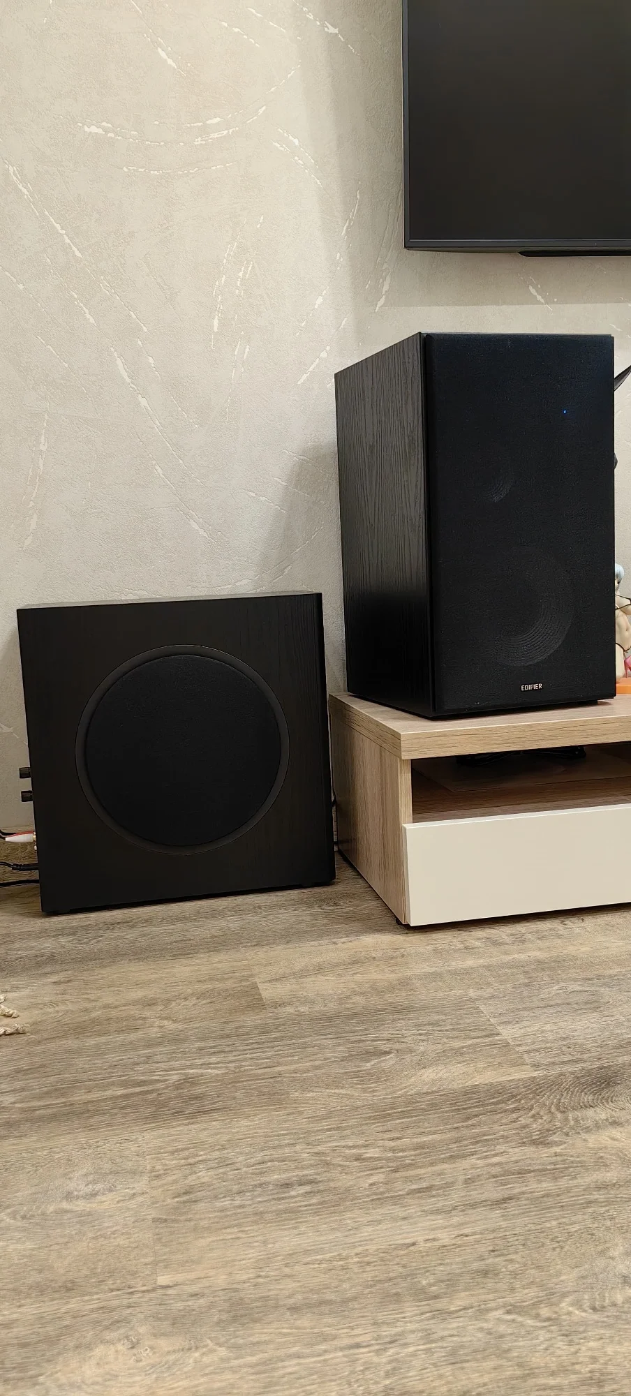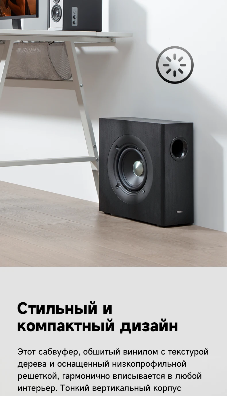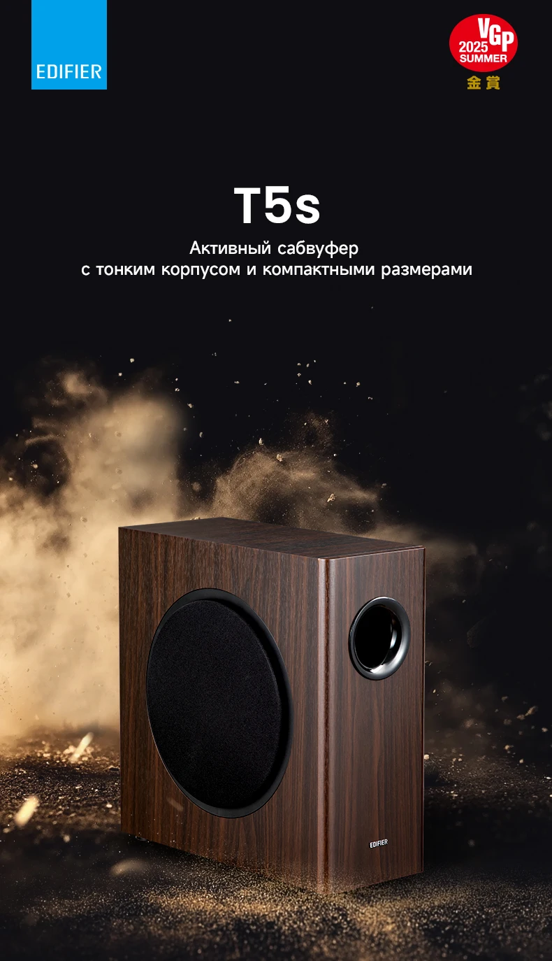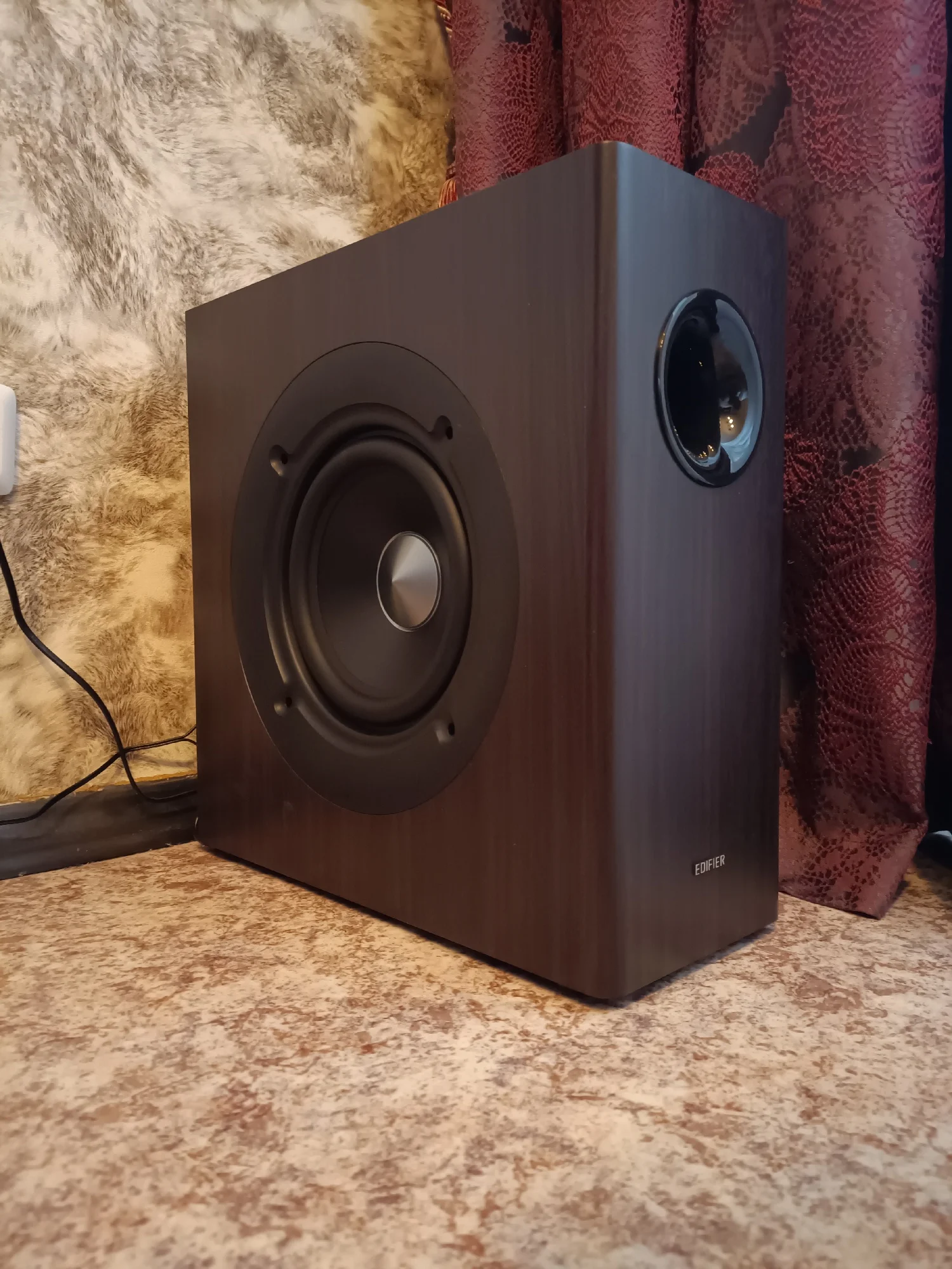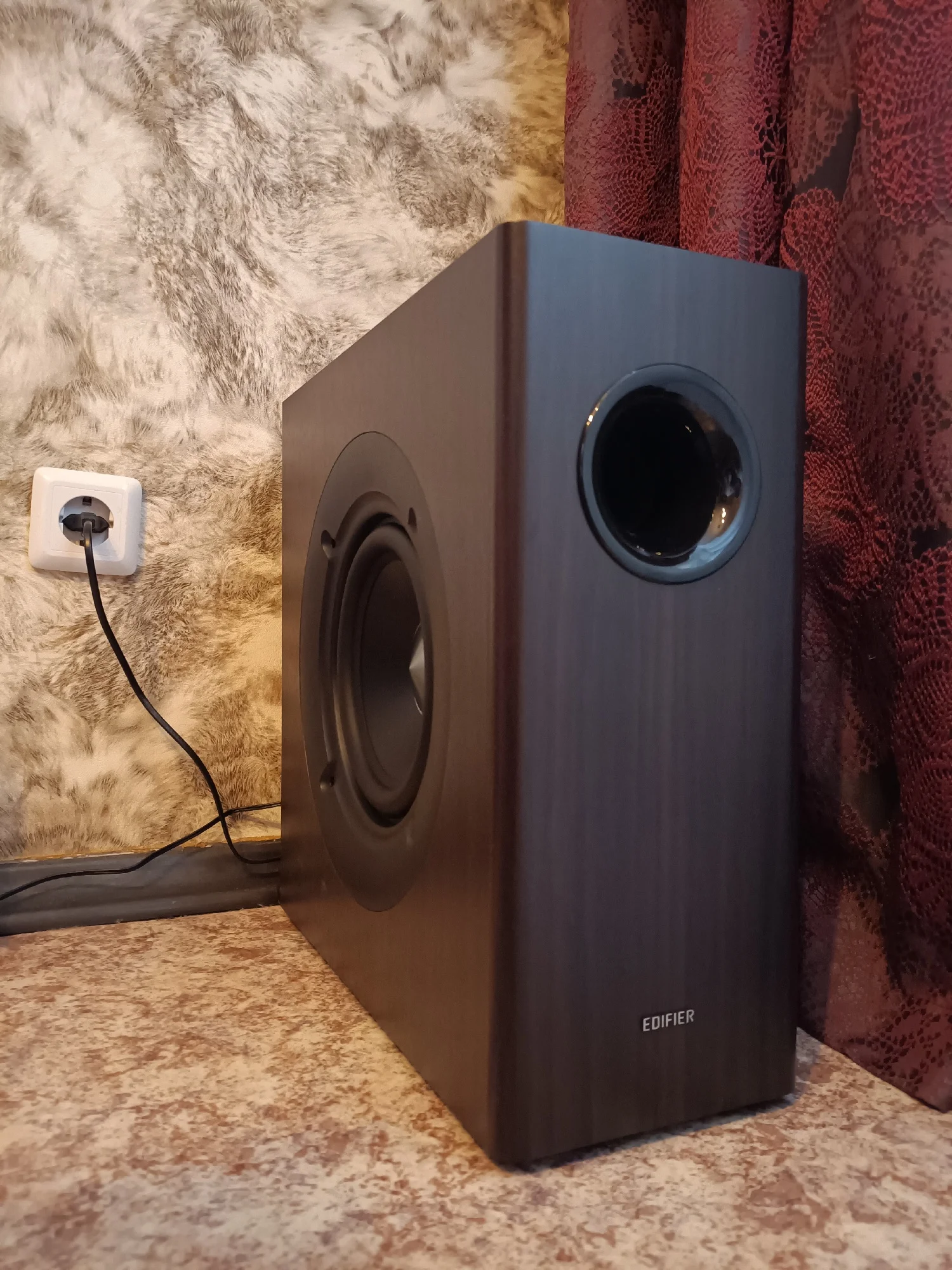 Все отлично. Давно хотел саб в спальню к моим Airpulse A80. Рассматривал Edifire T5, но огромные габариты и внешний вид отталкивали от этой затеи. Недавно снова задался вопросом о сабе, и на глаза попался Edifire T5s, посмотрел обзоры и решился на покупку. На момент покупки, на AliExpress была самая низкая цена, поэтому выбор был очевиден. Доставка быстрая, почтой России доставили со склада из Львовского до Уфы за 6 дней. Упаковка надёжная, в две картонные коробки с логотипами Edifire. Товар с упаковкой весит 13.5 кг, и имеет большие габариты, но при этом на упаковке нет никаких ручек или отверстий для рук, поэтому нести не очень удобно, но авто выручает. Подключил к отдельному выходу на саб к Airpulse A80, баса хватает с большим избытком. В моем случае, по ощущениям, лучше играет в противофазе. Из недостатков могу отметить, что для комфортного прослушивания пришлось регулятор громкости убавить на минимум, насколько это возможно, хотелось бы, чтобы ещё был запас в минус, а его нет, хотя вроде уровень баса при этом как раз то, что нужно. Возможно это в связке с Airpulse A80. Регулятор среза частот выкрутил на максимум вправо. Через 15 минут после выключения источника звука, саб переходит в режим ожидания, о чем свидетельствует очень яркий светодиод на задней панели. Во время работы светодиод излучает зелёный свет, и уже не такой яркий. Корпус изготовлен очень добротно, темно коричневый цвет идеально вписался в спальню. Ножки массивные, прорезиненные, стоит на них очень устойчиво. В комплекте два кабеля: RCA-RCA и RCA-Mini jack. Провода в комплекте немного коротковаты, но в моем случае нужен всего один канал RCA, поэтому я разделил кабель RCA на две части и, через переходник, подключил одну половину кабеля к другой, таким образом длина кабеля увеличилась в два раза. В целом покупкой очень доволен, колоночки заиграли совершенно по другому. Всем добра и уюта!)