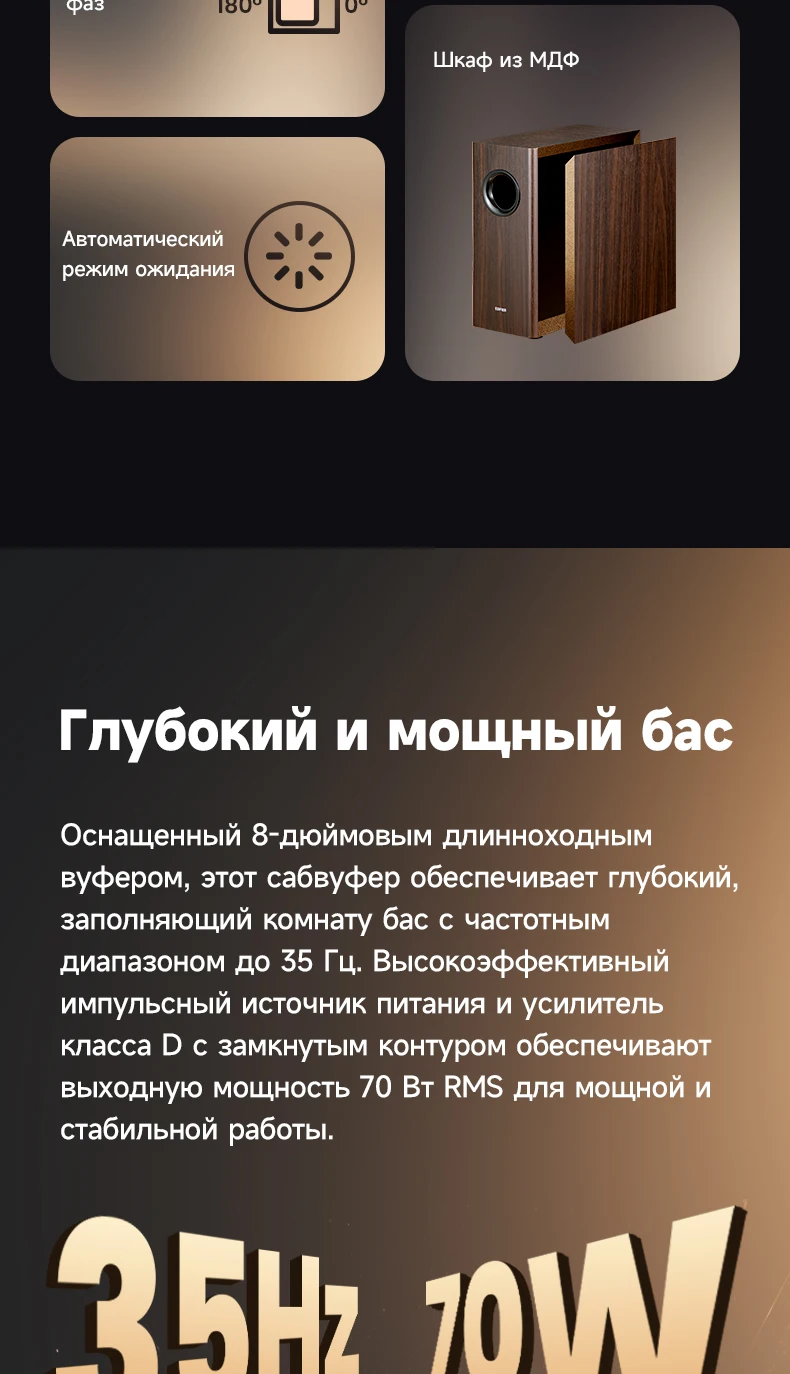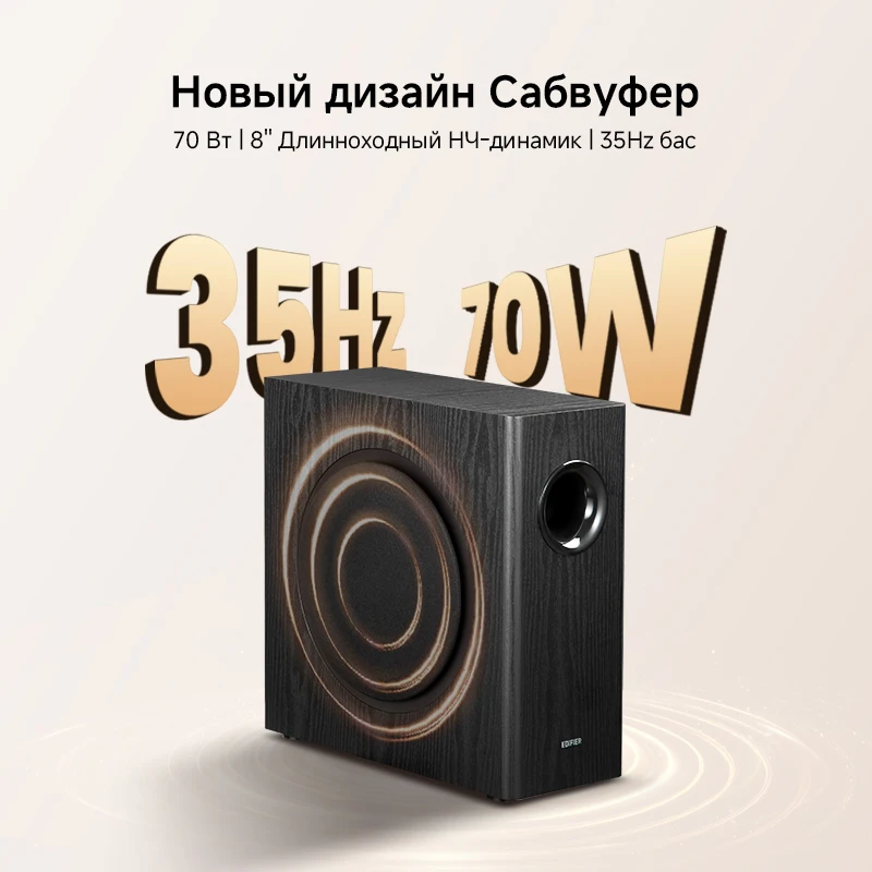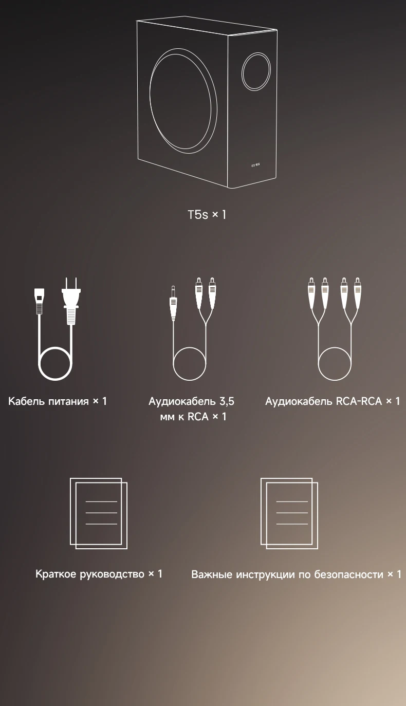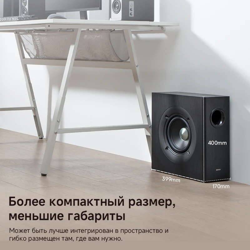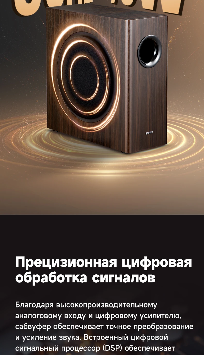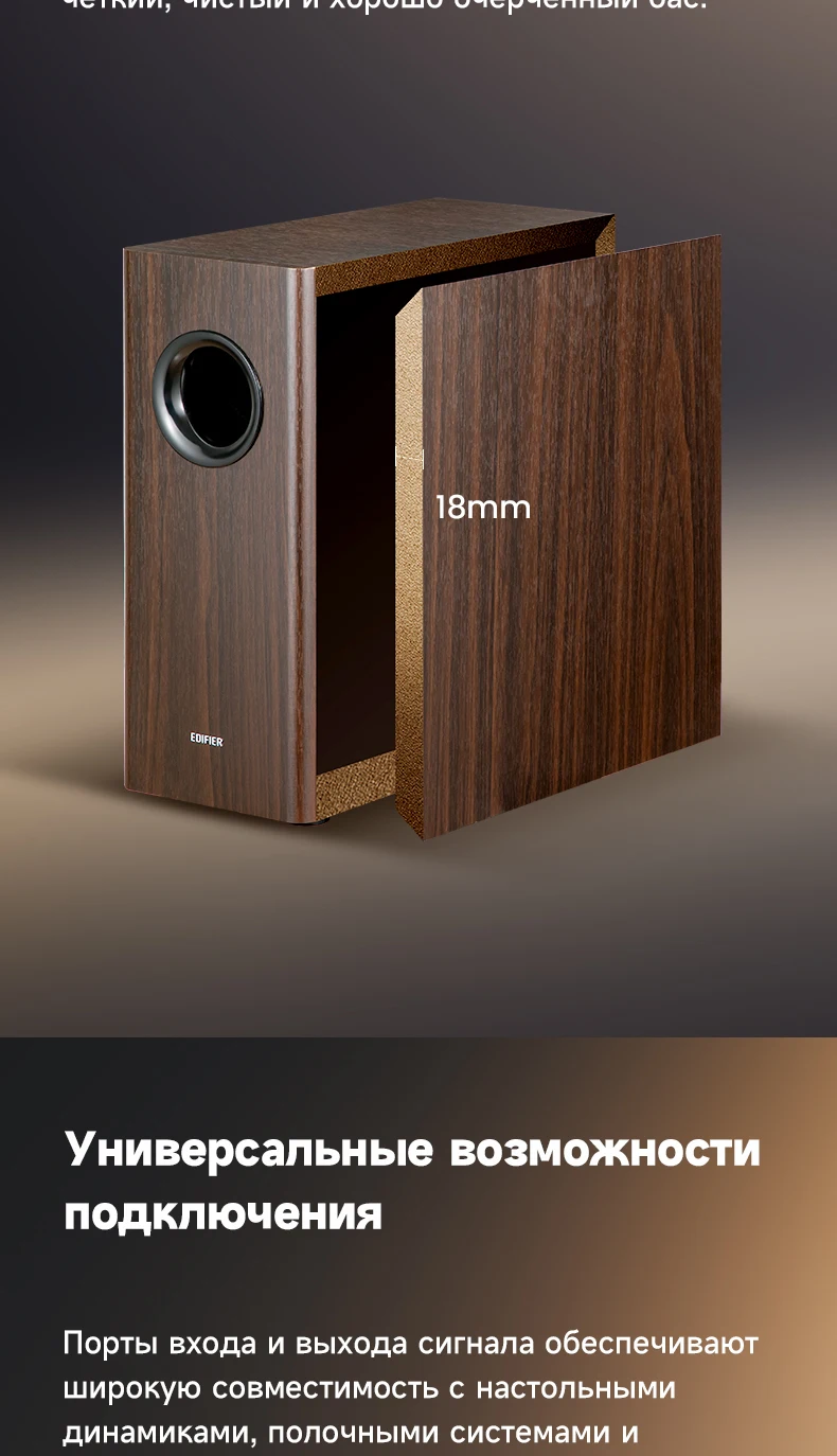 Все отлично. Давно хотел саб в спальню к моим Airpulse A80. Рассматривал Edifire T5, но огромные габариты и внешний вид отталкивали от этой затеи. Недавно снова задался вопросом о сабе, и на глаза попался Edifire T5s, посмотрел обзоры и решился на покупку. На момент покупки, на AliExpress была самая низкая цена, поэтому выбор был очевиден. Доставка быстрая, почтой России доставили со склада из Львовского до Уфы за 6 дней. Упаковка надёжная, в две картонные коробки с логотипами Edifire. Товар с упаковкой весит 13.5 кг, и имеет большие габариты, но при этом на упаковке нет никаких ручек или отверстий для рук, поэтому нести не очень удобно, но авто выручает. Подключил к отдельному выходу на саб к Airpulse A80, баса хватает с большим избытком. В моем случае, по ощущениям, лучше играет в противофазе. Из недостатков могу отметить, что для комфортного прослушивания пришлось регулятор громкости убавить на минимум, насколько это возможно, хотелось бы, чтобы ещё был запас в минус, а его нет, хотя вроде уровень баса при этом как раз то, что нужно. Возможно это в связке с Airpulse A80. Регулятор среза частот выкрутил на максимум вправо. Через 15 минут после выключения источника звука, саб переходит в режим ожидания, о чем свидетельствует очень яркий светодиод на задней панели. Во время работы светодиод излучает зелёный свет, и уже не такой яркий. Корпус изготовлен очень добротно, темно коричневый цвет идеально вписался в спальню. Ножки массивные, прорезиненные, стоит на них очень устойчиво. В комплекте два кабеля: RCA-RCA и RCA-Mini jack. Провода в комплекте немного коротковаты, но в моем случае нужен всего один канал RCA, поэтому я разделил кабель RCA на две части и, через переходник, подключил одну половину кабеля к другой, таким образом длина кабеля увеличилась в два раза. В целом покупкой очень доволен, колоночки заиграли совершенно по другому. Всем добра и уюта!)