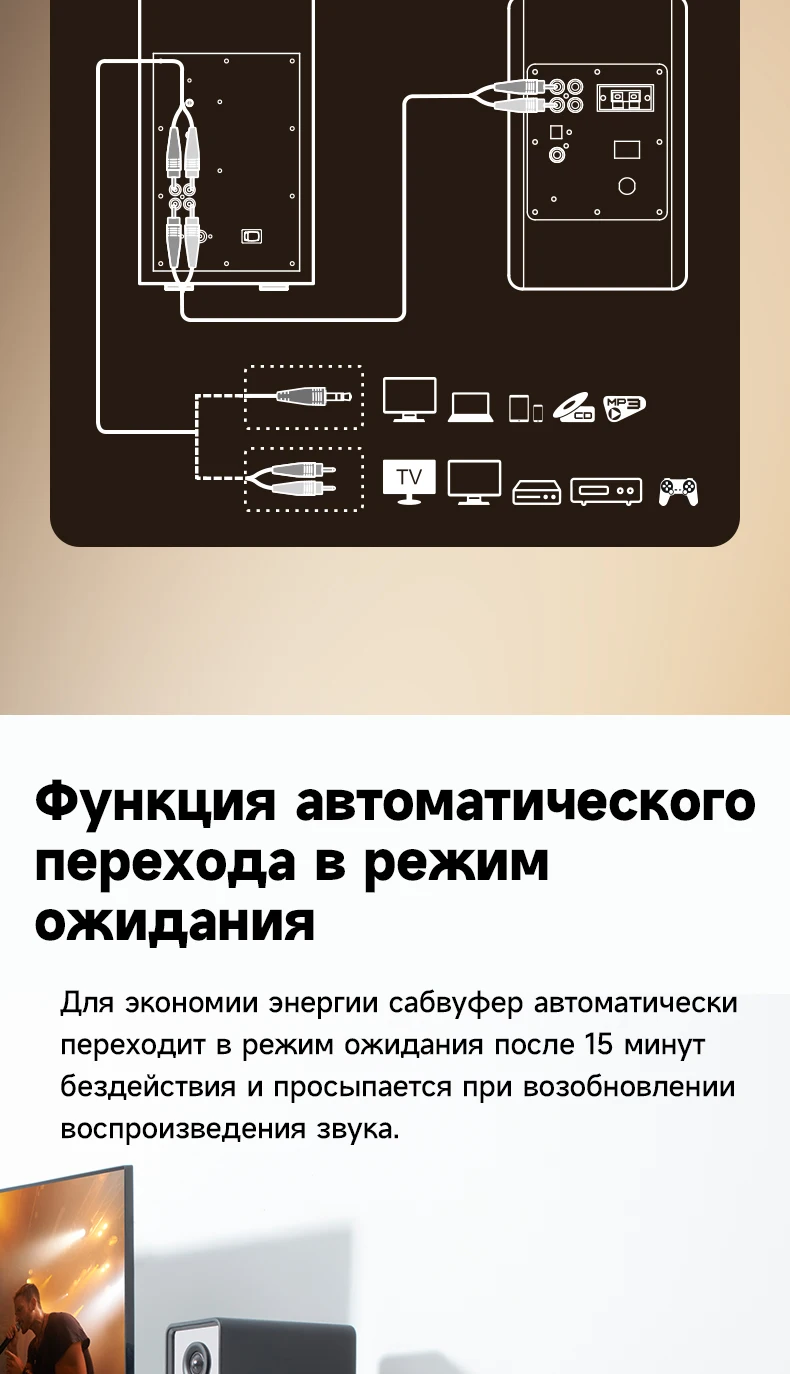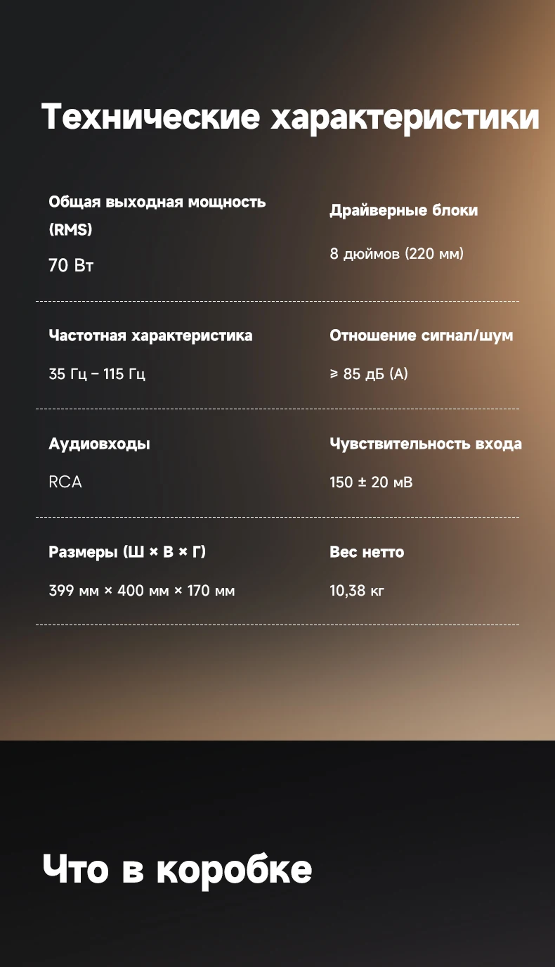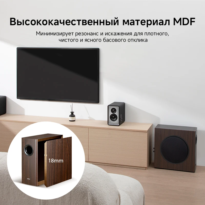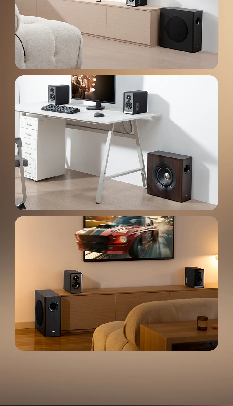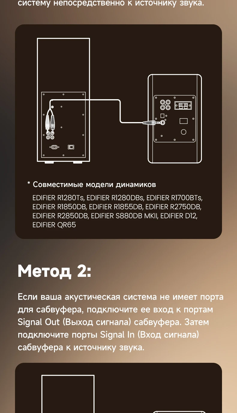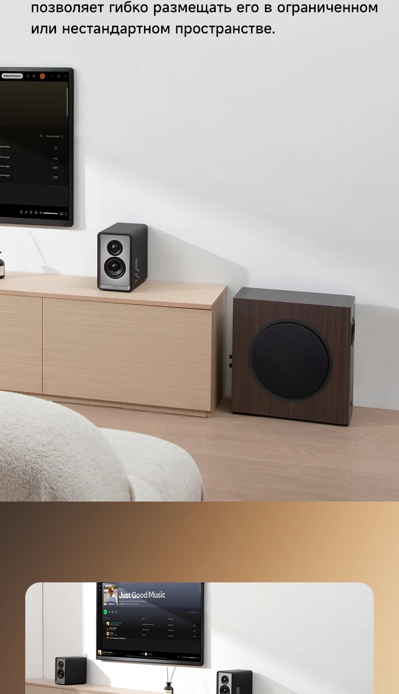 Все отлично. Давно хотел саб в спальню к моим Airpulse A80. Рассматривал Edifire T5, но огромные габариты и внешний вид отталкивали от этой затеи. Недавно снова задался вопросом о сабе, и на глаза попался Edifire T5s, посмотрел обзоры и решился на покупку. На момент покупки, на AliExpress была самая низкая цена, поэтому выбор был очевиден. Доставка быстрая, почтой России доставили со склада из Львовского до Уфы за 6 дней. Упаковка надёжная, в две картонные коробки с логотипами Edifire. Товар с упаковкой весит 13.5 кг, и имеет большие габариты, но при этом на упаковке нет никаких ручек или отверстий для рук, поэтому нести не очень удобно, но авто выручает. Подключил к отдельному выходу на саб к Airpulse A80, баса хватает с большим избытком. В моем случае, по ощущениям, лучше играет в противофазе. Из недостатков могу отметить, что для комфортного прослушивания пришлось регулятор громкости убавить на минимум, насколько это возможно, хотелось бы, чтобы ещё был запас в минус, а его нет, хотя вроде уровень баса при этом как раз то, что нужно. Возможно это в связке с Airpulse A80. Регулятор среза частот выкрутил на максимум вправо. Через 15 минут после выключения источника звука, саб переходит в режим ожидания, о чем свидетельствует очень яркий светодиод на задней панели. Во время работы светодиод излучает зелёный свет, и уже не такой яркий. Корпус изготовлен очень добротно, темно коричневый цвет идеально вписался в спальню. Ножки массивные, прорезиненные, стоит на них очень устойчиво. В комплекте два кабеля: RCA-RCA и RCA-Mini jack. Провода в комплекте немного коротковаты, но в моем случае нужен всего один канал RCA, поэтому я разделил кабель RCA на две части и, через переходник, подключил одну половину кабеля к другой, таким образом длина кабеля увеличилась в два раза. В целом покупкой очень доволен, колоночки заиграли совершенно по другому. Всем добра и уюта!)