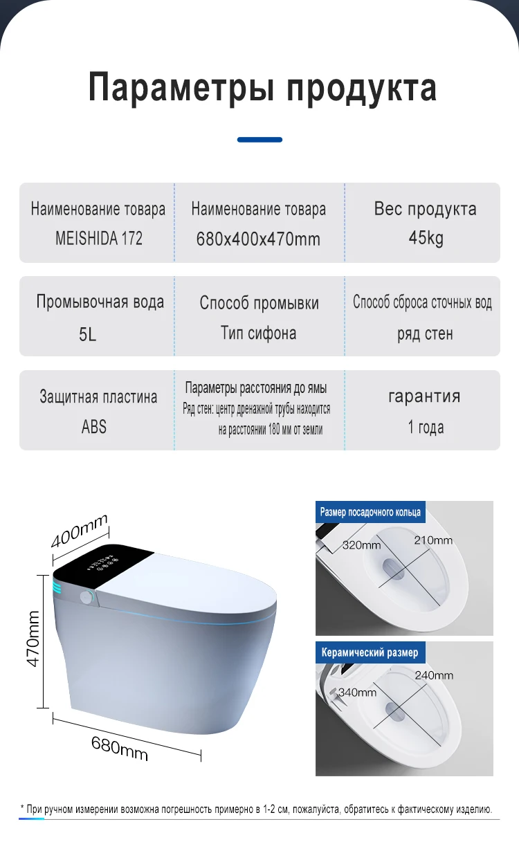 Приехал заказ раньше срока должен был быть 22 сентября, приехал 9 сентября, и со сбоя интернета моем городе я не знал что заказ прыбыла пункт выдачи, продавец молодец после как я заказал, он сразу со мной связался WhatsApp, и спосил сток канализация у меня а стены или от пола, и предложил другого унитаз по качеству лучше, по словам, скину ссылку чтобы я наглядно посмотрел что он себя представляет мне он понравился, а так со скидкой обошелся мне 19289₽ это цена максимальная чтобы указано. А так унитаз 👍 в комплекте пульт на русском языке, инструкция на русском, жаль что видеообзор нельза выстовит на AliExpress, а только фотографии, надеюсь когда-нибудь алиэкспресс исправить эту ошибку, чтобы покупатель лучший представление было о товаре. А так рекоментую этот магазин, продавец кразавчик, всегда на связи.