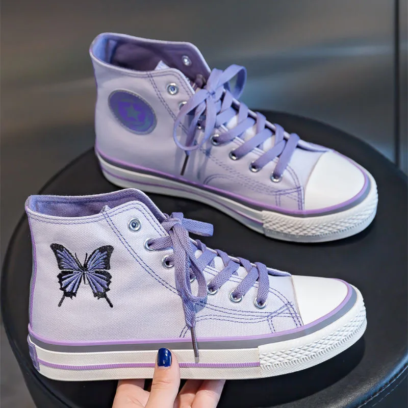 Фиолетовый с вышитыми бабочками; Женская полотняная кроссовки с лоскутными вставками; Эспадрильи для девочек Светоотражающие черного цвета в стиле «хип-хоп» с дышащей сеткой Дамская обувь
